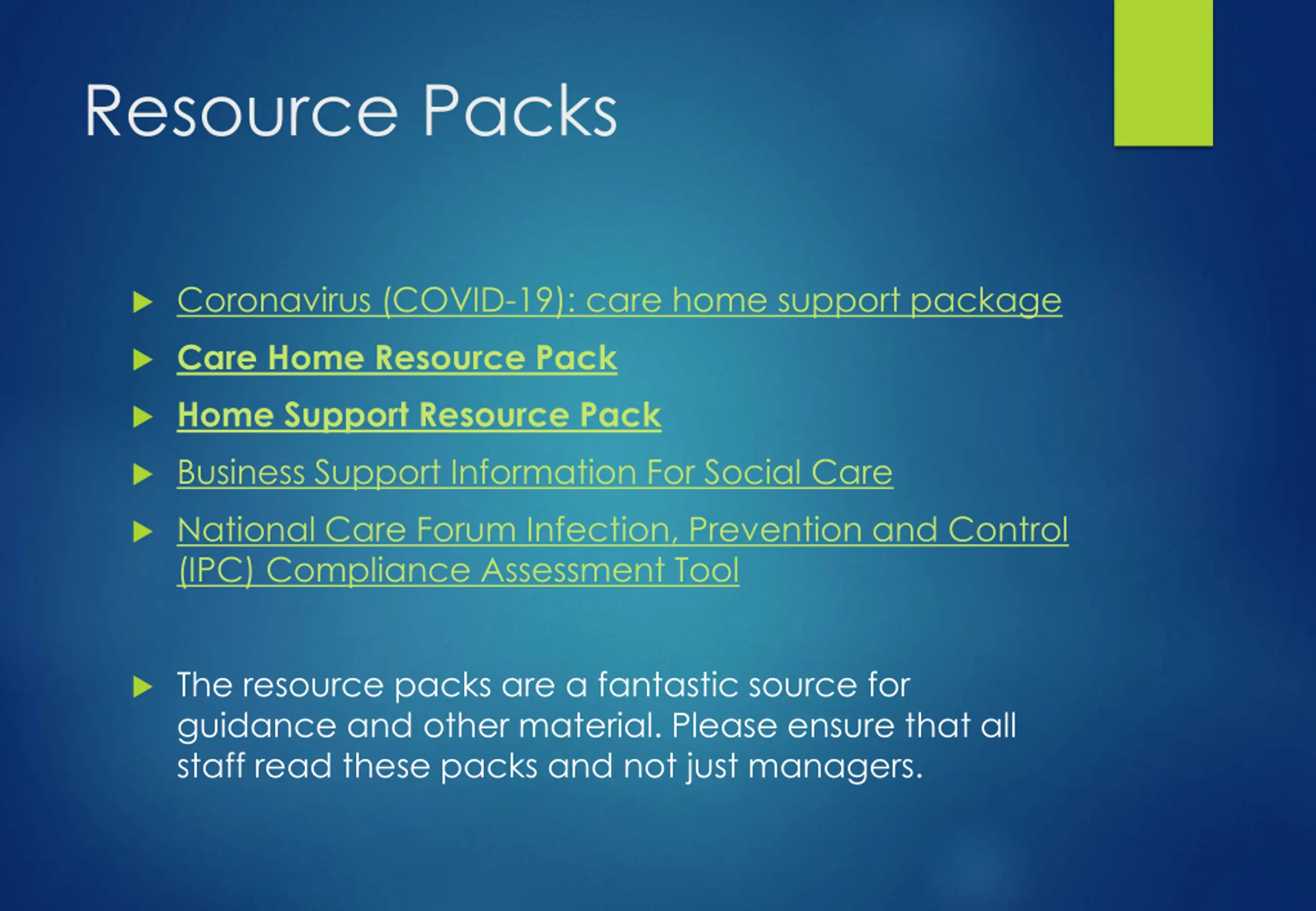 Resource Packs Coronavirus (COVID-19): care home support package Care Home Resource Pack Home Support Resource Pack Business Support Information For Social Care National Care Forum Infection, Prevention and Control (IPC) Compliance Assessment Tool The resource packs are a fantastic source for guidance and other material. Please ensure that all staff read these packs and not just managers.