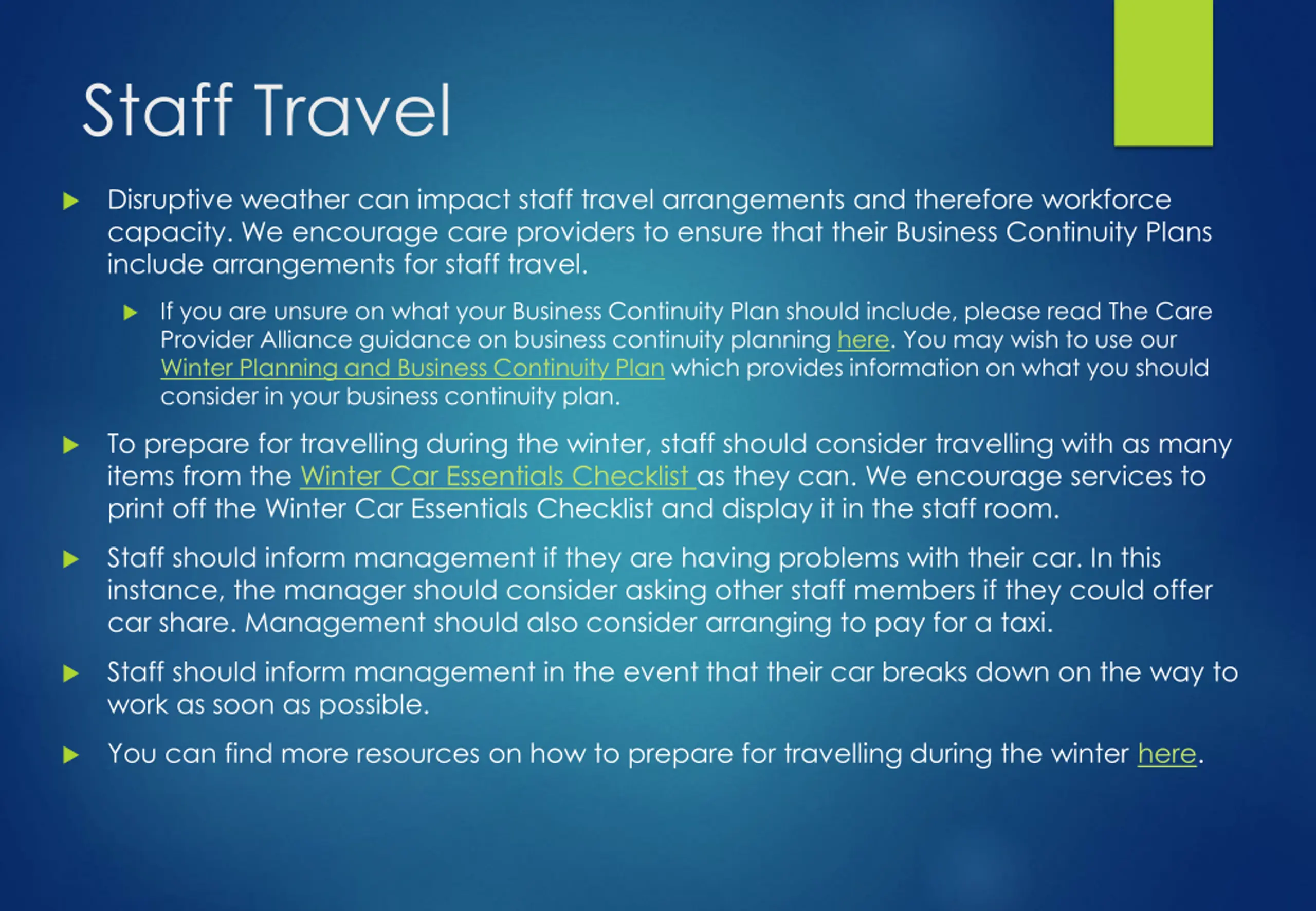 Staff Travel Disruptive weather can impact staff travel arrangements and therefore workforce capacity. We encourage care providers to ensure that their Business Continuity Plans include arrangements for staff travel. If you are unsure on what your Business Continuity Plan should include, please read The Care Provider Alliance guidance on business continuity planning here. You may wish to use our Winter Planning and Business Continuity Plan which provides information on what you should consider in your business continuity plan. To prepare for travelling during the winter, staff should consider travelling with as many items from the Winter Car Essentials Checklist as they can. We encourage services to print off the Winter Car Essentials Checklist and display it in the staff room. Staff should inform management if they are having problems with their car. In this instance, the manager should consider asking other staff members if they could offer car share. Management should also consider arranging to pay for a taxi. Staff should inform management in the event that their car breaks down on the way to work as soon as possible. You can find more resources on how to prepare for travelling during the winter here.