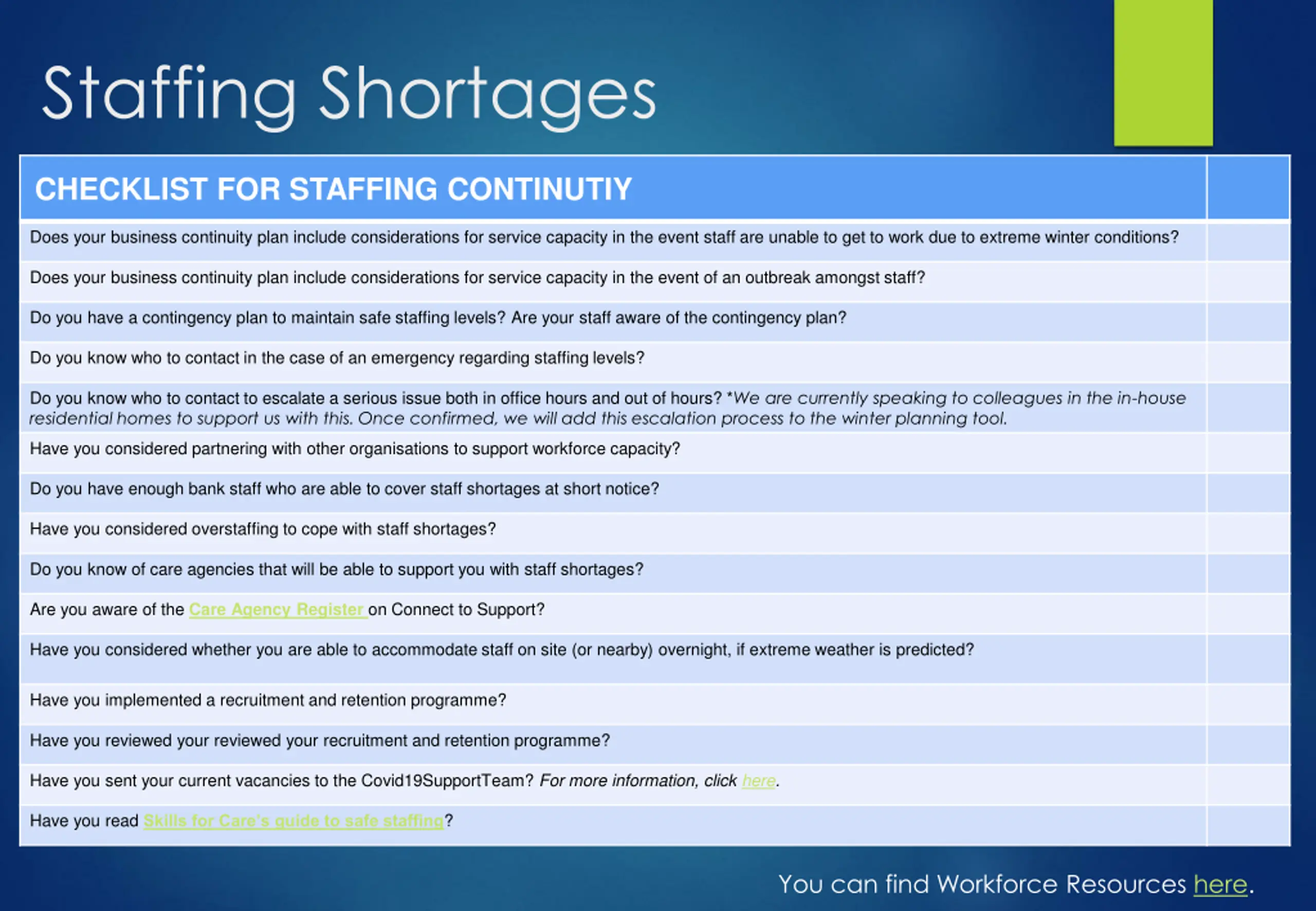 Staffing Shortages CHECKLIST FOR STAFFING CONTINUTIY Does your business continuity plan include considerations for service capacity in the event staff are unable to get to work due to extreme winter conditions? Does your business continuity plan include considerations for service capacity in the event of an outbreak amongst staff? Do you have a contingency plan to maintain safe staffing levels? Are your staff aware of the contingency plan? Do you know who to contact in the case of an emergency regarding staffing levels? Do you know who to contact to escalate a serious issue both in office hours and out of hours? *We are currently speaking to colleagues in the in-house residential homes to support us with this. Once confirmed, we will add this escalation process to the winter planning tool. Have you considered partnering with other organisations to support workforce capacity? Do you have enough bank staff who are able to cover staff shortages at short notice? Have you considered overstaffing to cope with staff shortages? Do you know of care agencies that will be able to support you with staff shortages? Are you aware of the Care Agency Register on Connect to Support? Have you considered whether you are able to accommodate staff on site (or nearby) overnight, if extreme weather is predicted? Have you implemented a recruitment and retention programme? Have you reviewed your reviewed your recruitment and retention programme? Have you sent your current vacancies to the Covid19SupportTeam? For more information, click here. Have youreadSkills for Care s guide to safe staffing? You can find Workforce Resources here.