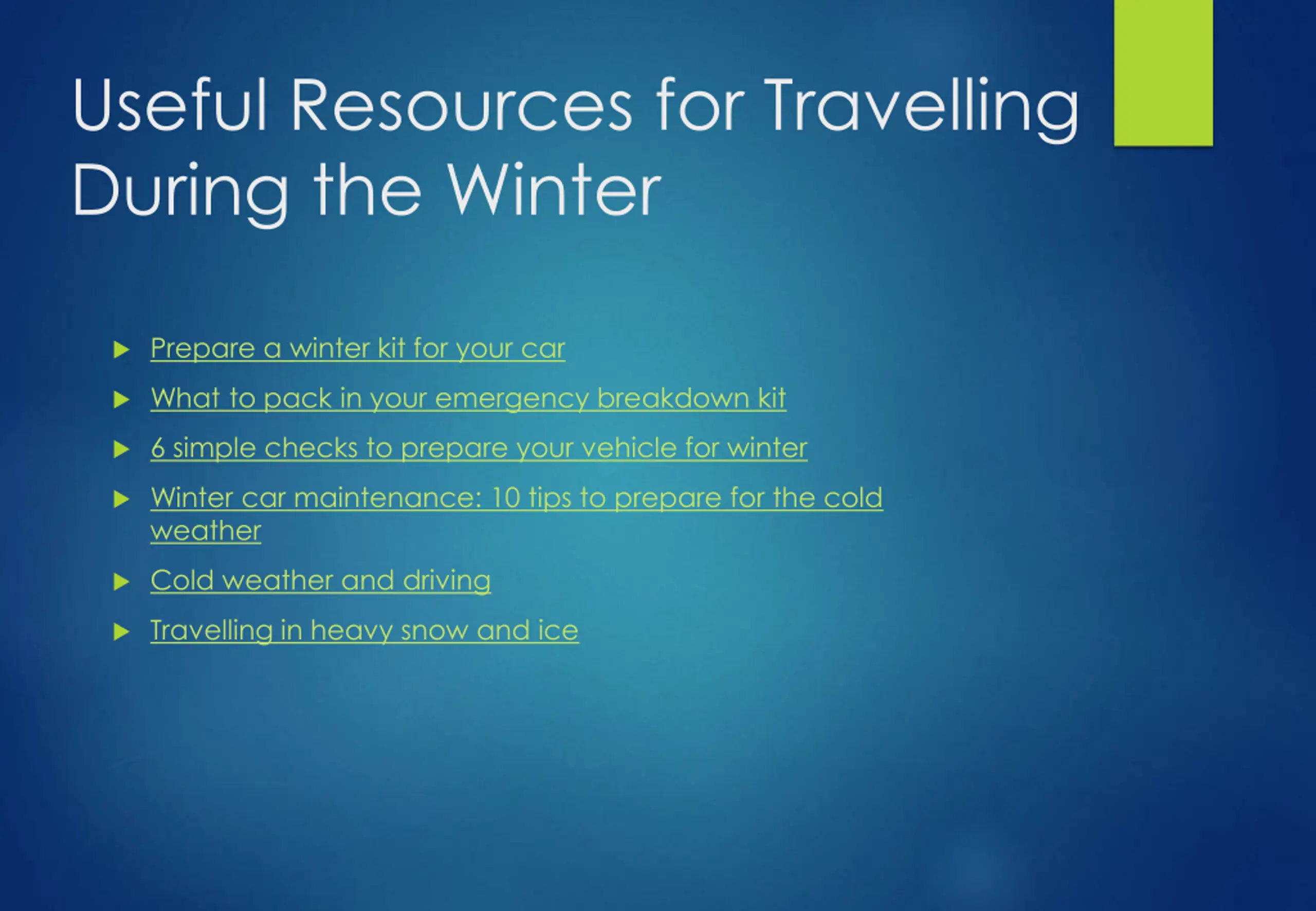 Useful Resources for Travelling During the Winter Prepare a winter kit for your car What to pack in your emergency breakdown kit 6 simple checks to prepare your vehicle for winter Winter car maintenance: 10 tips to prepare for the cold weather Cold weather and driving Travelling in heavy snow and ice