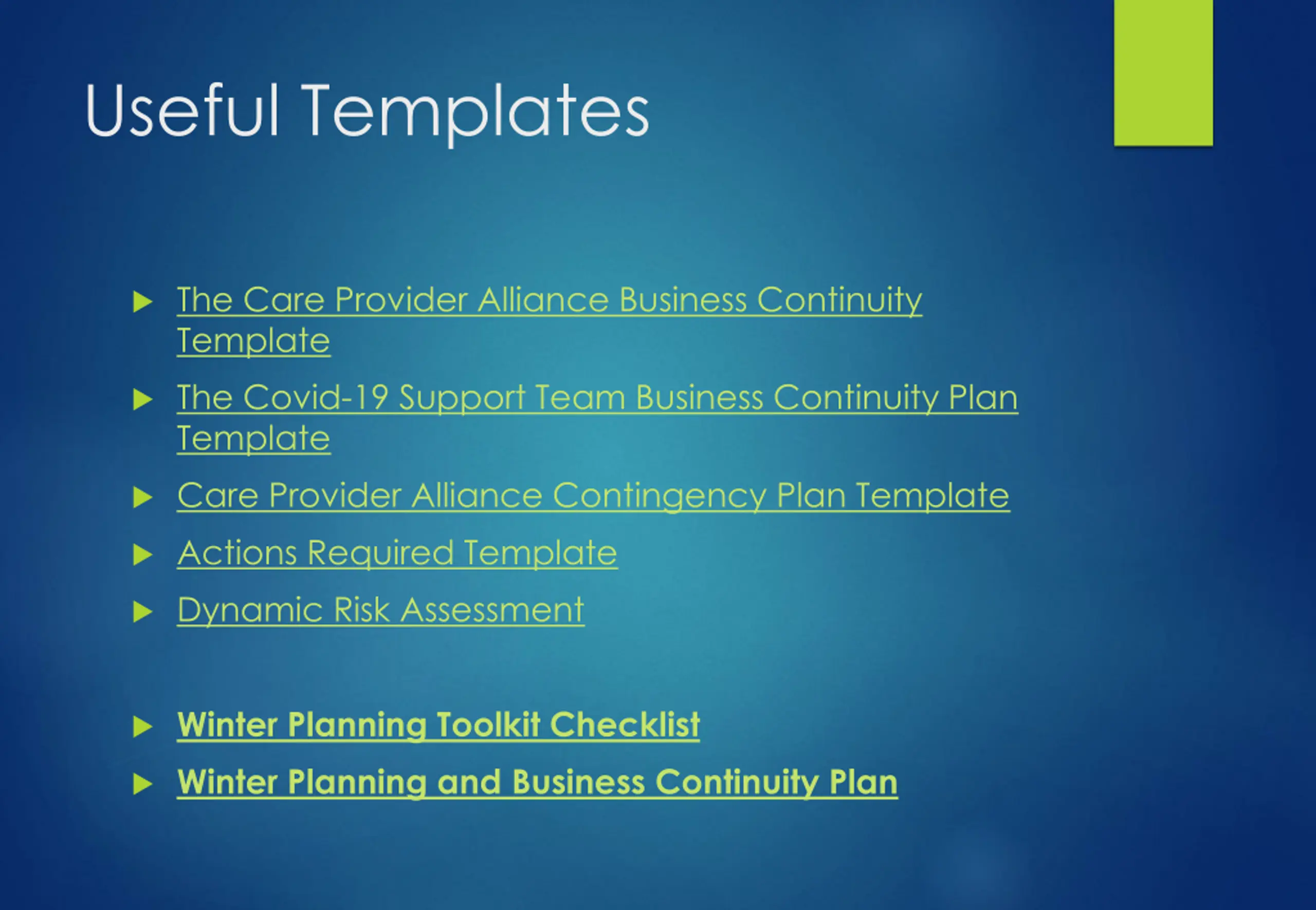 Useful Templates The Care Provider Alliance Business Continuity Template The Covid-19 Support Team Business Continuity Plan Template Care Provider Alliance Contingency Plan Template Actions Required Template Dynamic Risk Assessment Winter Planning Toolkit Checklist Winter Planning and Business Continuity Plan