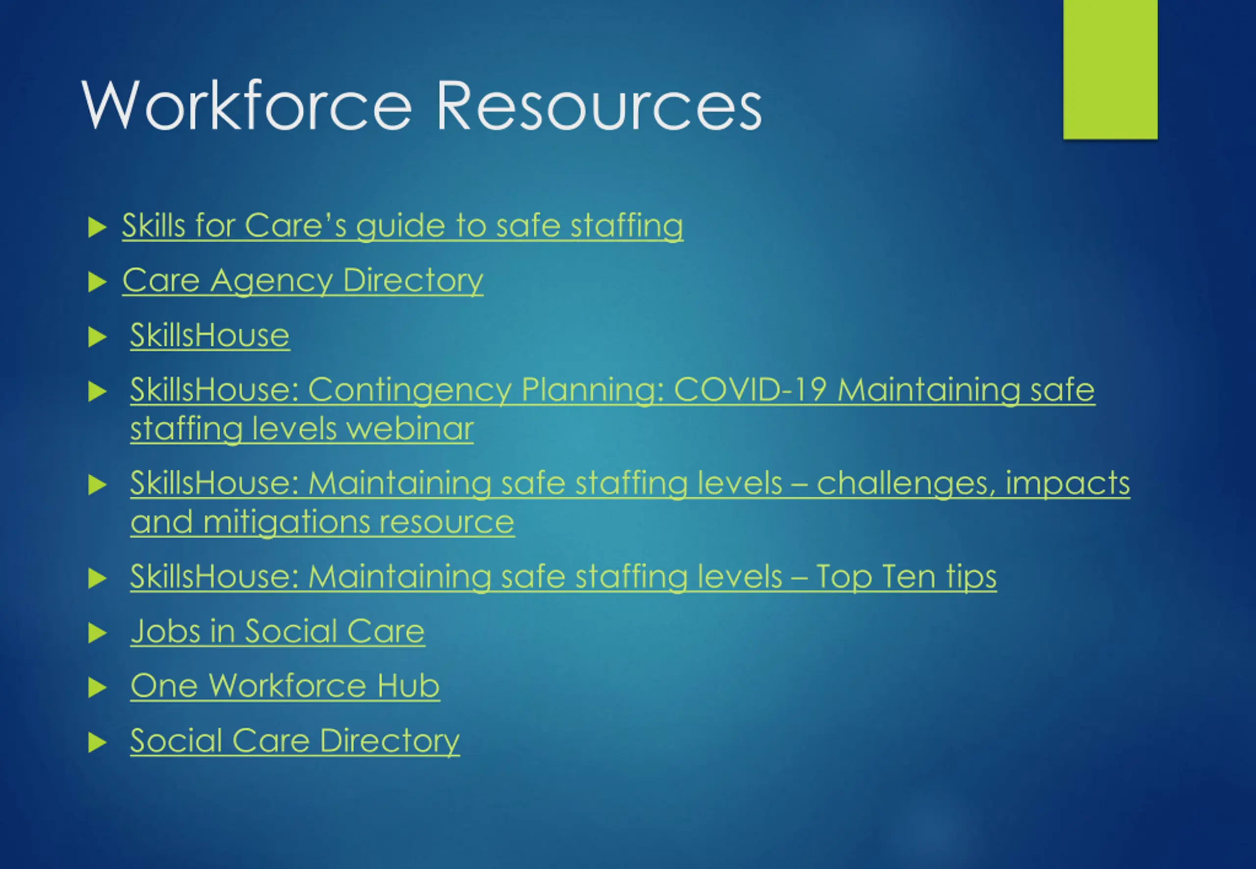 Workforce Resources Skills for Care s guide to safe staffing Care Agency Directory SkillsHouse SkillsHouse: Contingency Planning: COVID-19 Maintaining safe staffing levels webinar SkillsHouse: Maintaining safe staffing levels challenges, impacts and mitigations resource SkillsHouse: Maintaining safe staffing levels Top Ten tips Jobs in Social Care One Workforce Hub Social Care Directory