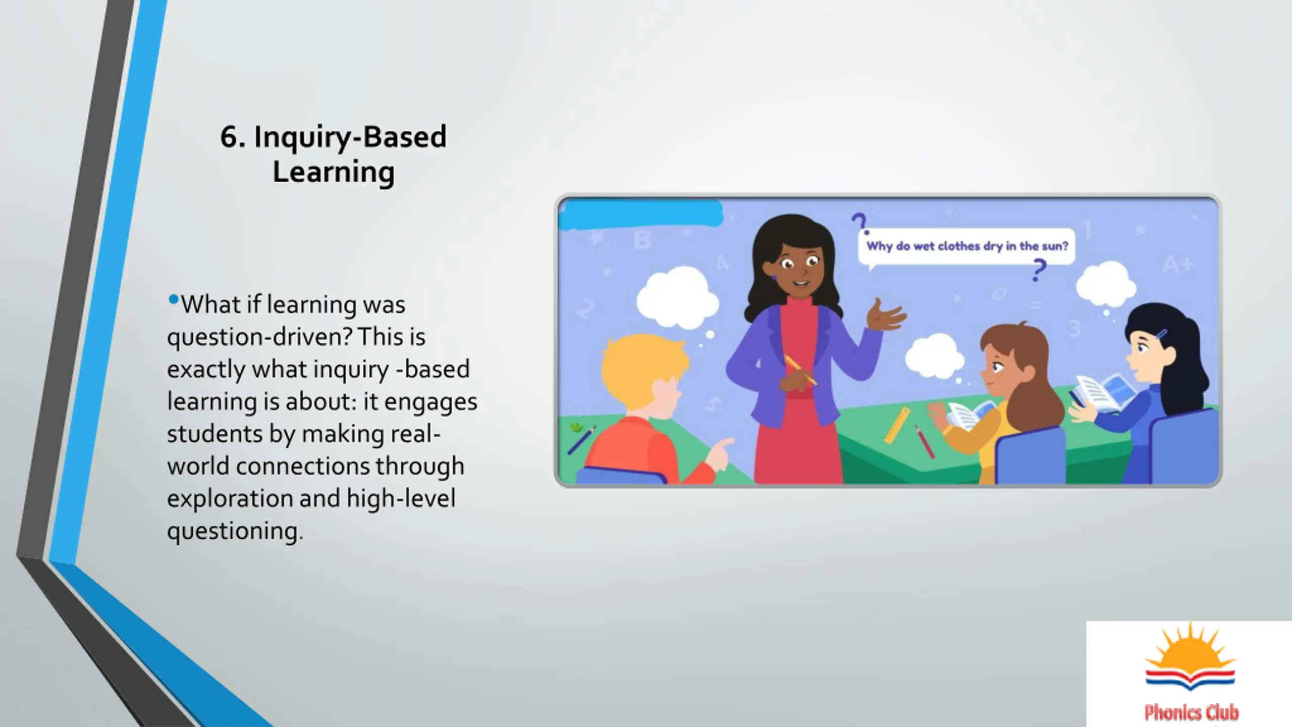 6. Inquiry-Based Learning What if learning was question-driven? This is exactly what inquiry -based learning is about: it engages students by making real- world connections through exploration and high-level questioning.