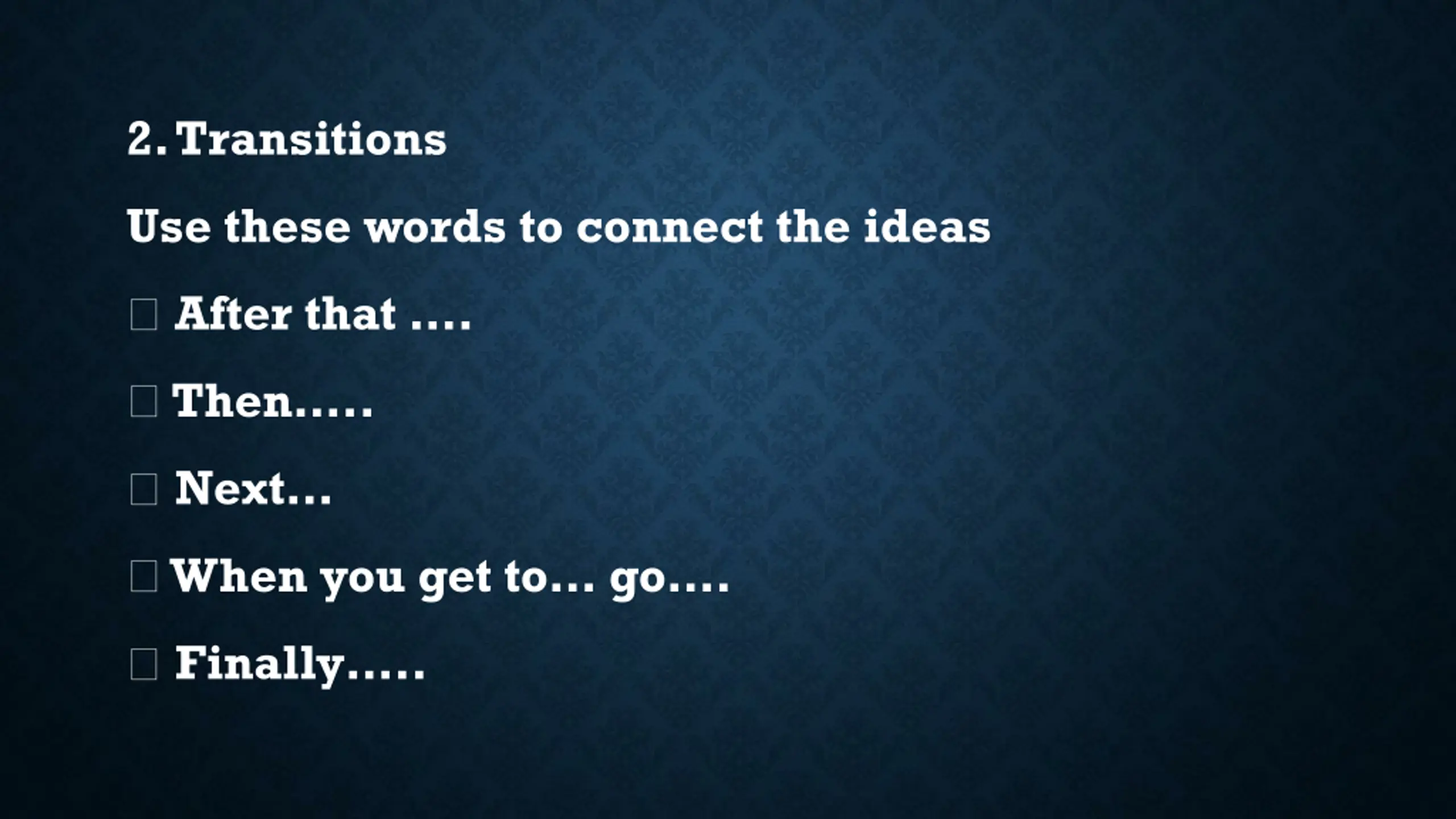 2. Transitions Use these words to connect the ideas After that . Then .. Next When you get to go . Finally ..