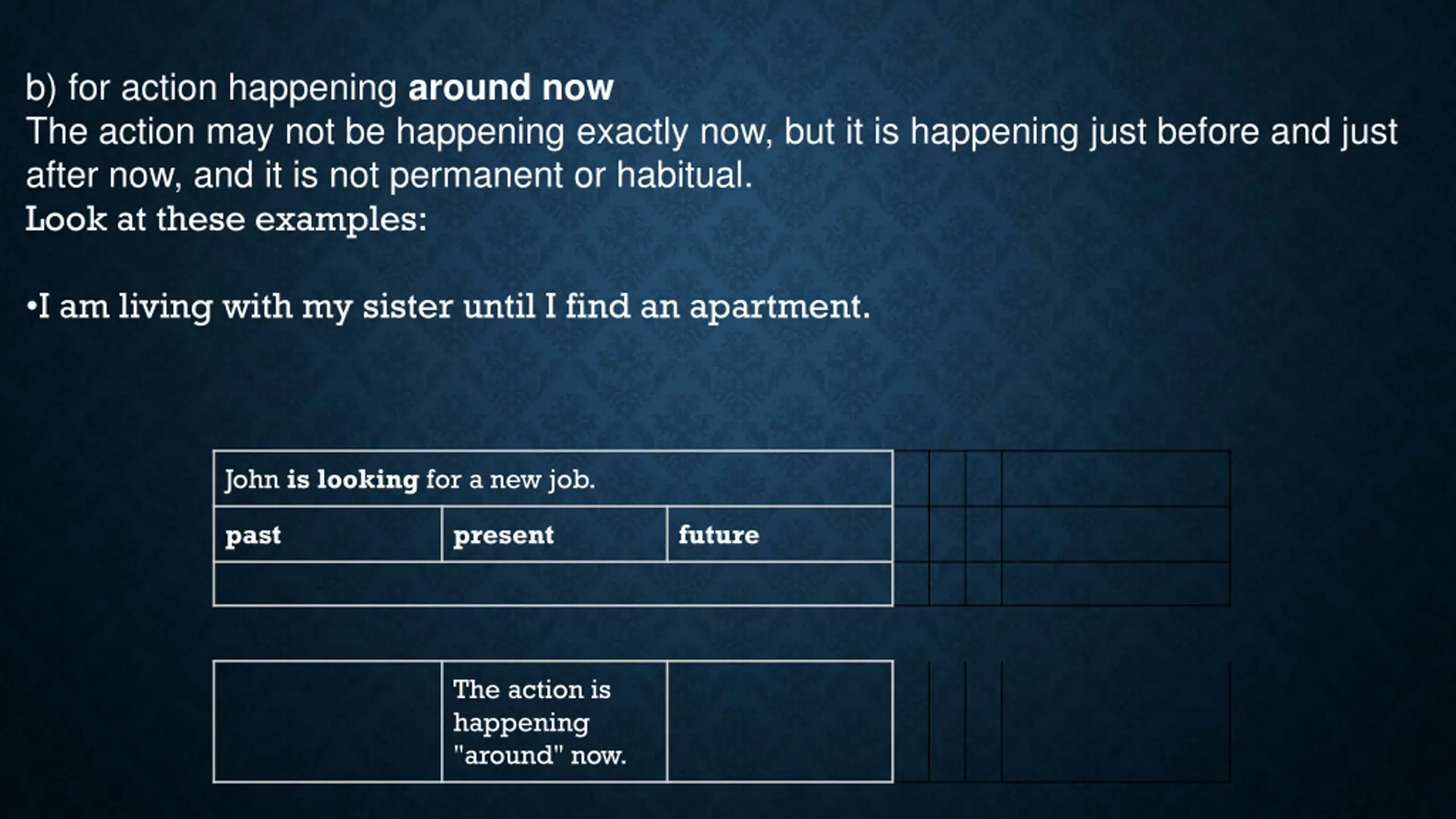 b) for action happening around now The action may not be happening exactly now, but it is happening just before and just after now, and it is not permanent or habitual. Look at these examples: I am living with my sister until I find an apartment. John is looking for a new job. past present future The action is happening "around" now.