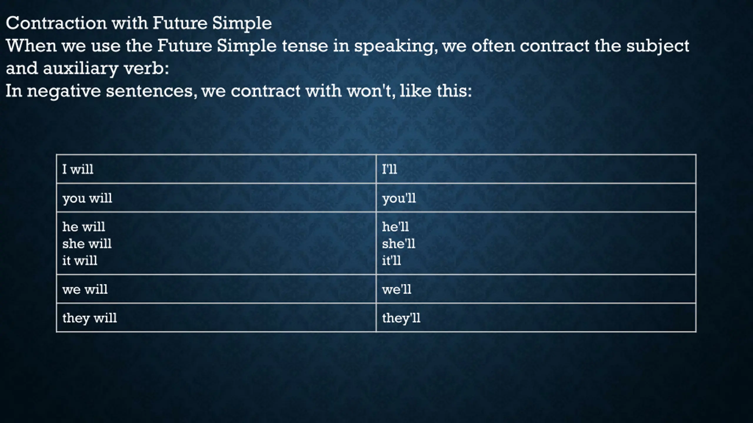 Contraction with Future Simple When we use the Future Simple tense in speaking, we often contract the subject and auxiliary verb: In negative sentences, we contract with won't, like this: I will I'll you will you'll he will she will it will he'll she'll it'll we will we'll they will they'll