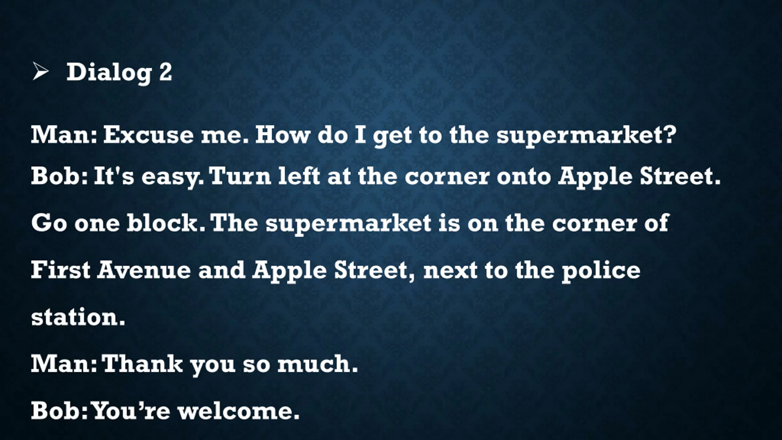 Dialog 2 Man: Excuse me. How do I get to the supermarket? Bob: It's easy. Turn left at the corner onto Apple Street. Go one block. The supermarket is on the corner of First Avenue and Apple Street, next to the police station. Man: Thank you so much. Bob: You re welcome.