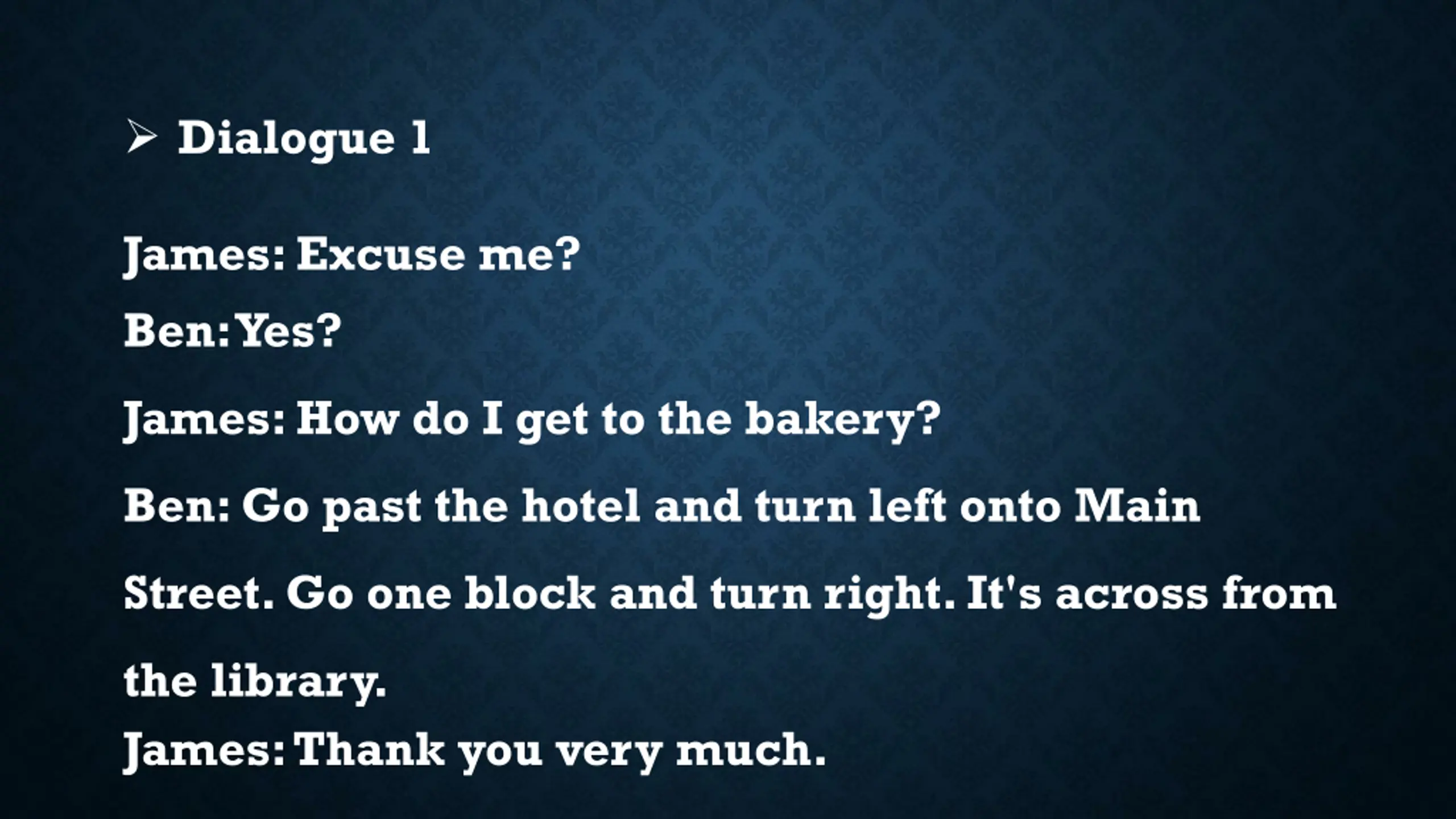 Dialogue 1 James: Excuse me? Ben: Yes? James: How do I get to the bakery? Ben: Go past the hotel and turn left onto Main Street. Go one block and turn right. It's across from the library. James: Thank you very much.
