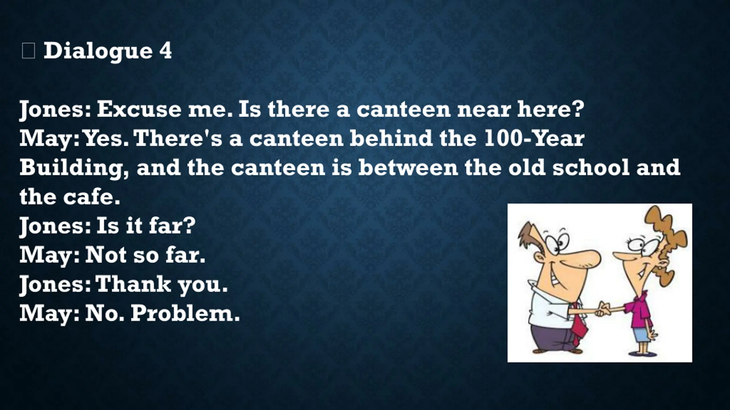 Dialogue 4 Jones: Excuse me. Is there a canteen near here? May: Yes. There's a canteen behind the 100-Year Building, and the canteen is between the old school and the cafe. Jones: Is it far? May: Not so far. Jones: Thank you. May: No. Problem.