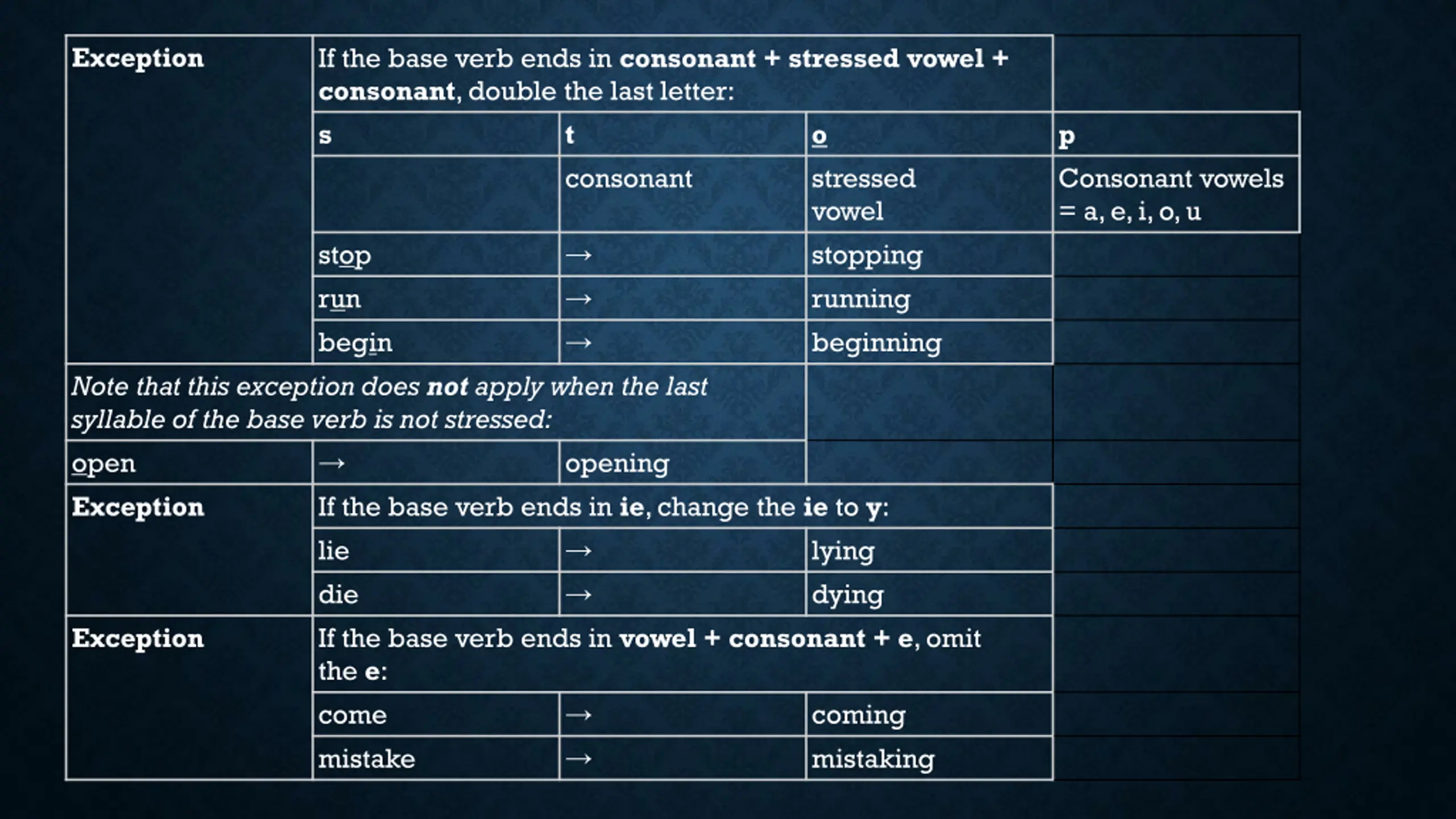 Exception If the base verb ends in consonant + stressed vowel + consonant, double the last letter: s t consonant o stressed vowel stopping running beginning p Consonant vowels = a, e, i, o, u stop run begin Note that this exception does not apply when the last syllable of the base verb is not stressed: open Exception If the base verb ends in ie, change the ie to y: lie die Exception If the base verb ends in vowel + consonant + e, omit the e: come mistake opening lying dying coming mistaking