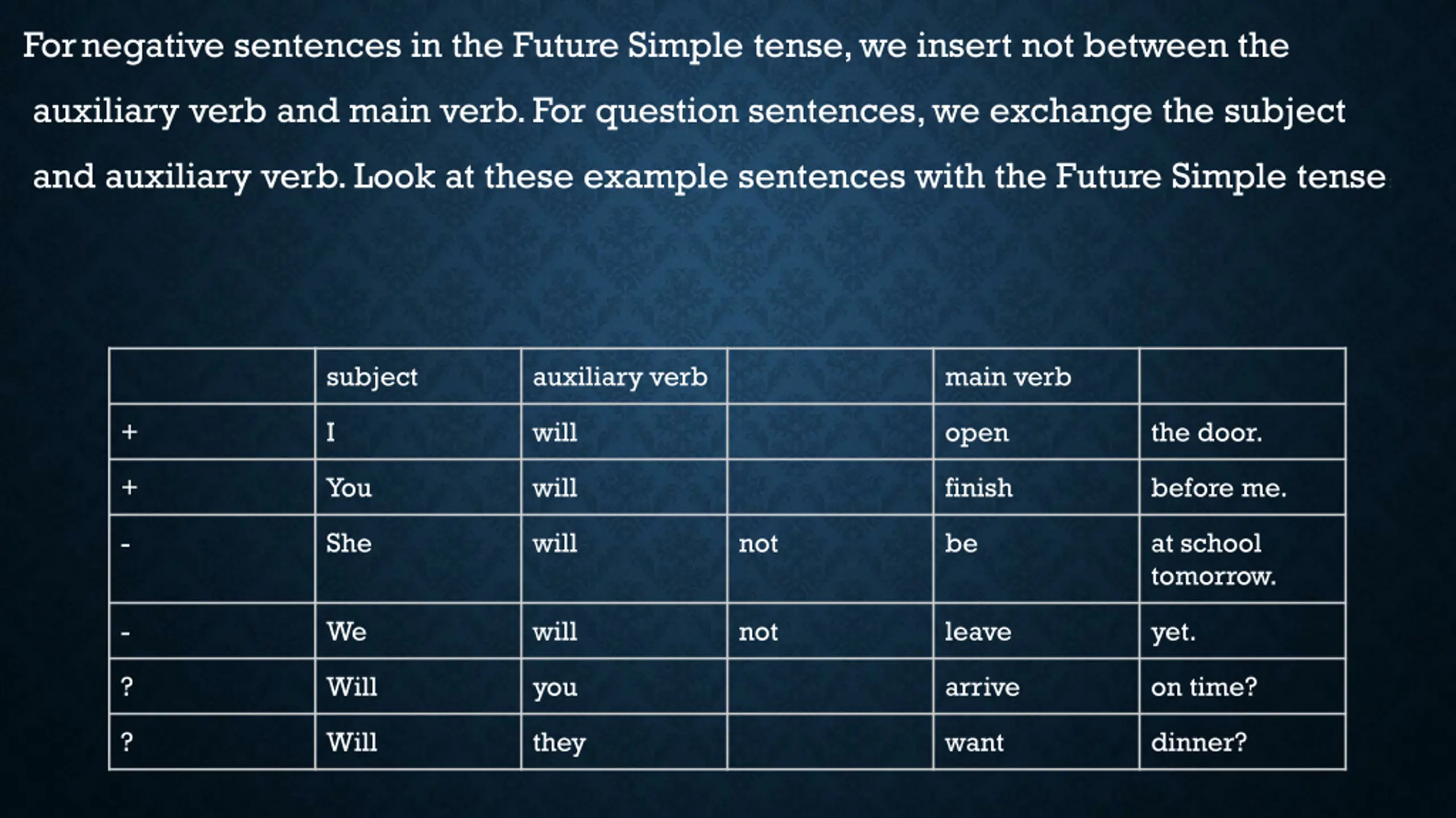 Fornegative sentences in the Future Simple tense, we insert not between the auxiliary verb and main verb. For question sentences, we exchange the subject and auxiliary verb. Look at these example sentences with the Future Simple tense: subject auxiliary verb main verb + I will open the door. + You will finish before me. - She will not be at school tomorrow. - We will not leave yet. ? Will you arrive on time? ? Will they want dinner?