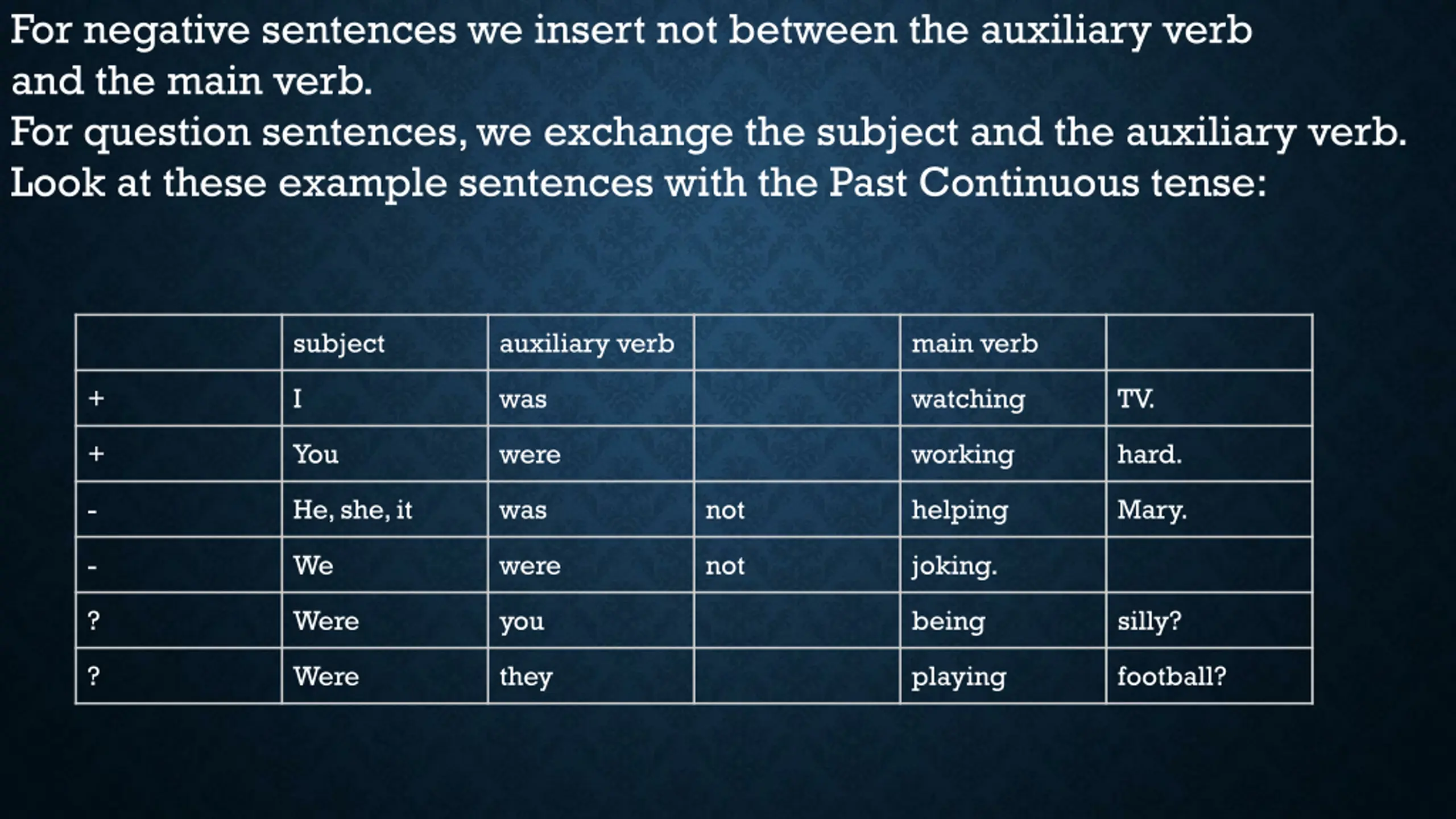 For negative sentences we insert not between the auxiliary verb and the main verb. For question sentences, we exchange the subject and the auxiliary verb. Look at these example sentences with the Past Continuous tense: subject auxiliary verb main verb + I was watching TV. + You were working hard. - He, she, it was not helping Mary. - We were not joking. ? Were you being silly? ? Were they playing football?