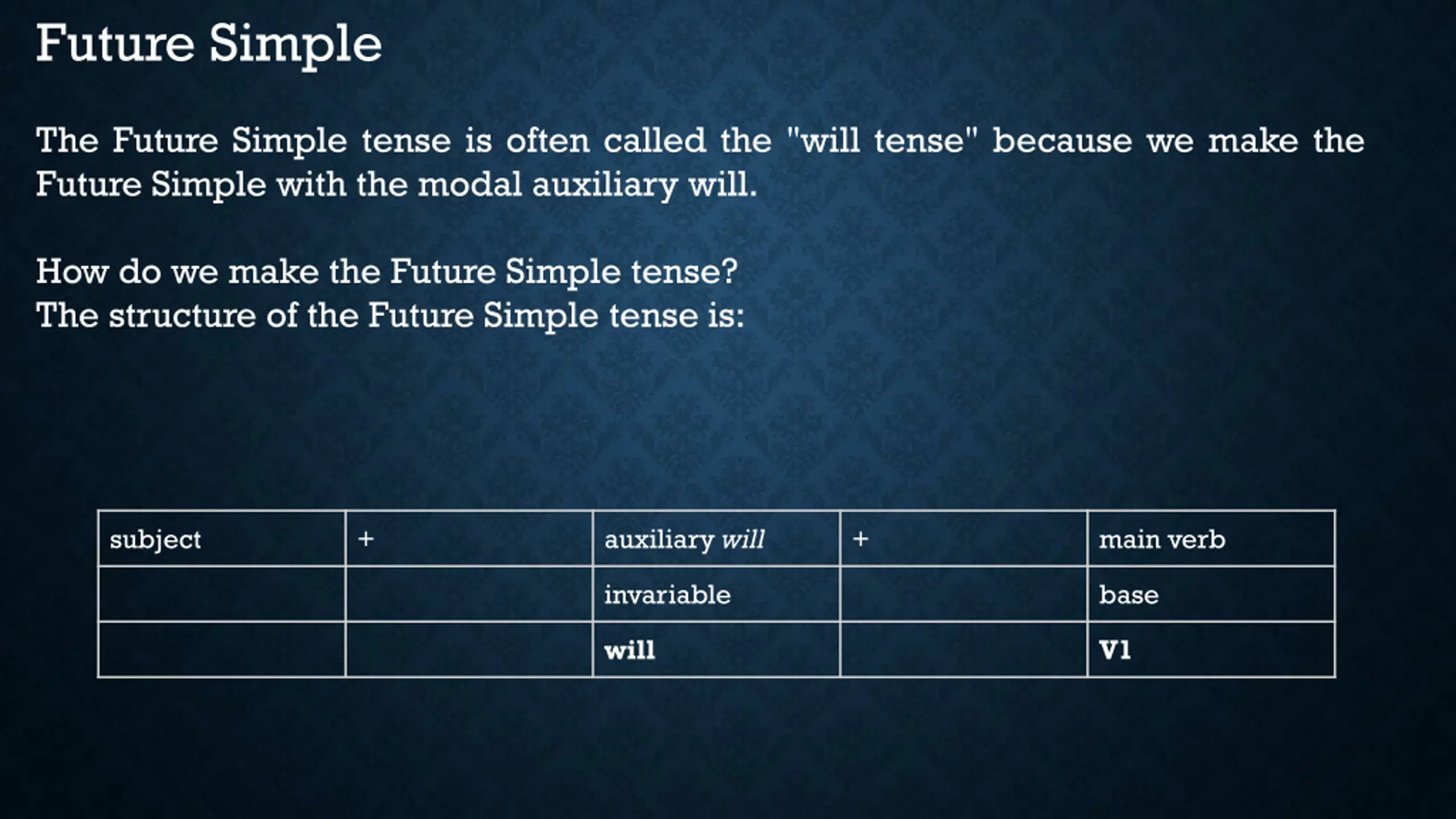 Future Simple The Future Simple tense is often called the "will tense" because we make the Future Simple with the modal auxiliary will. How do we make the Future Simple tense? The structure of the Future Simple tense is: subject + auxiliary will + main verb invariable base will V1
