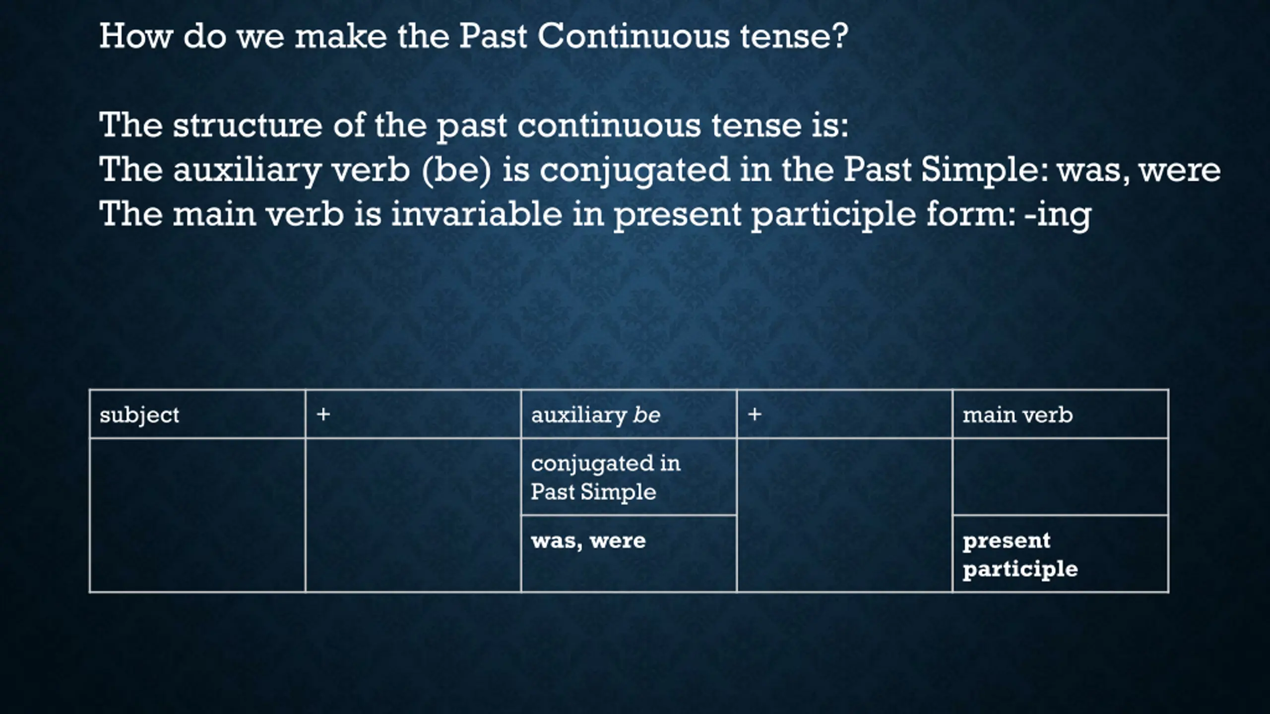 How do we make the Past Continuous tense? The structure of the past continuous tense is: The auxiliary verb (be) is conjugated in the Past Simple:was, were The main verb is invariable in present participle form:-ing subject + auxiliary be + main verb conjugated in Past Simple was, were present participle