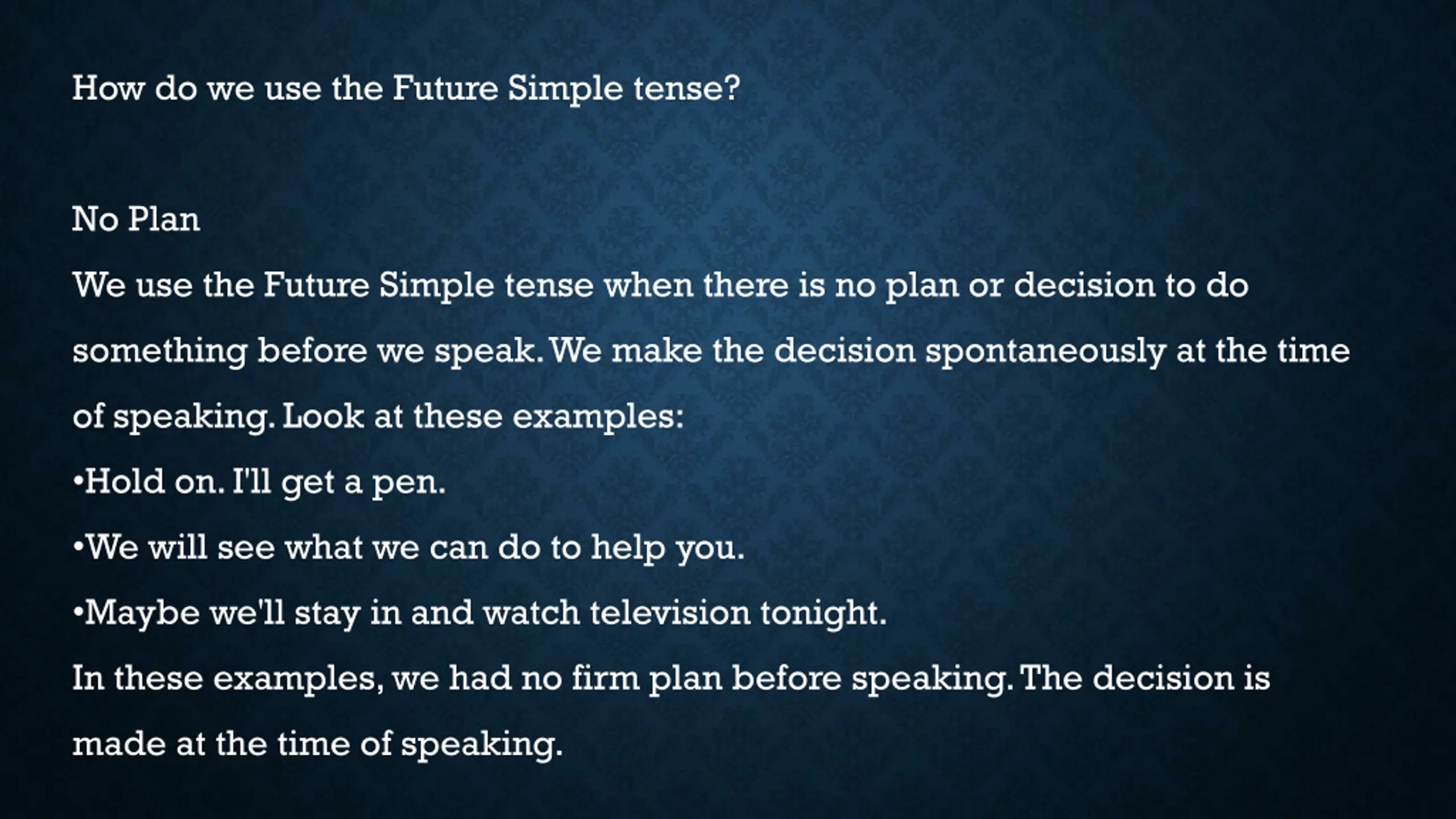 How do we use the Future Simple tense? No Plan We use the Future Simple tense when there is no plan or decision to do something before we speak. We make the decision spontaneously at the time of speaking. Look at these examples: Hold on. I'll get a pen. We will see what we can do to help you. Maybe we'll stay in and watch television tonight. In these examples, we had no firm plan before speaking. The decision is made at the time of speaking.