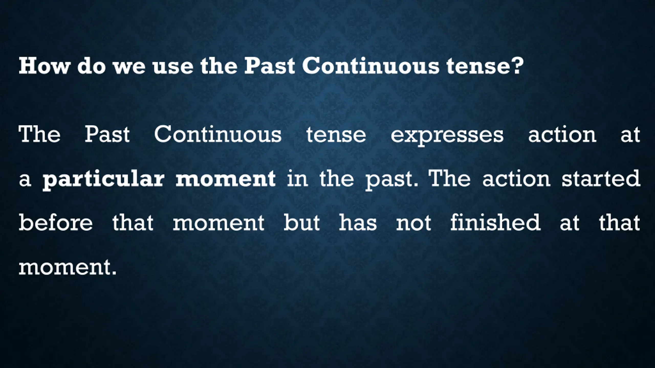 How do we use the Past Continuous tense? The Past Continuous tense expresses action at a particular moment in the past. The action started before that moment but has not finished at that moment.