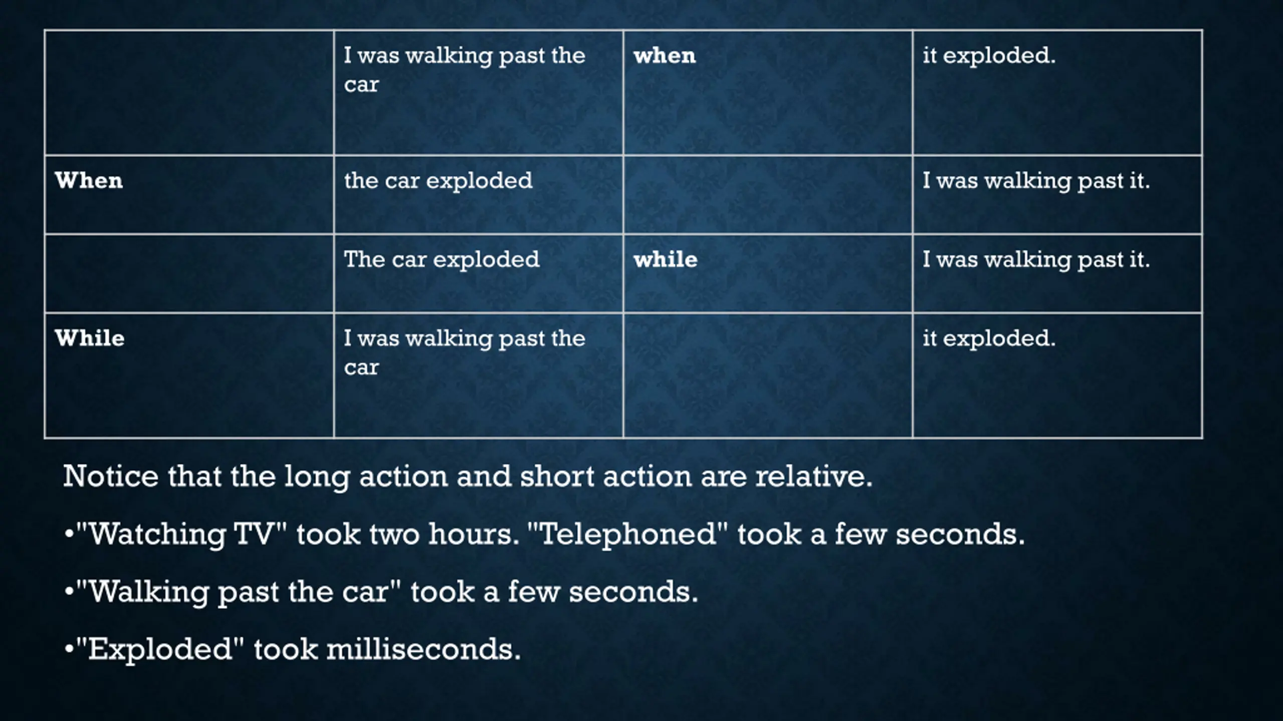 I was walking past the car when it exploded. When the car exploded I was walking past it. The car exploded while I was walking past it. While I was walking past the car it exploded. Notice that the long action and short action are relative. "Watching TV" took two hours. "Telephoned" took a few seconds. "Walking past the car" took a few seconds. "Exploded" took milliseconds.