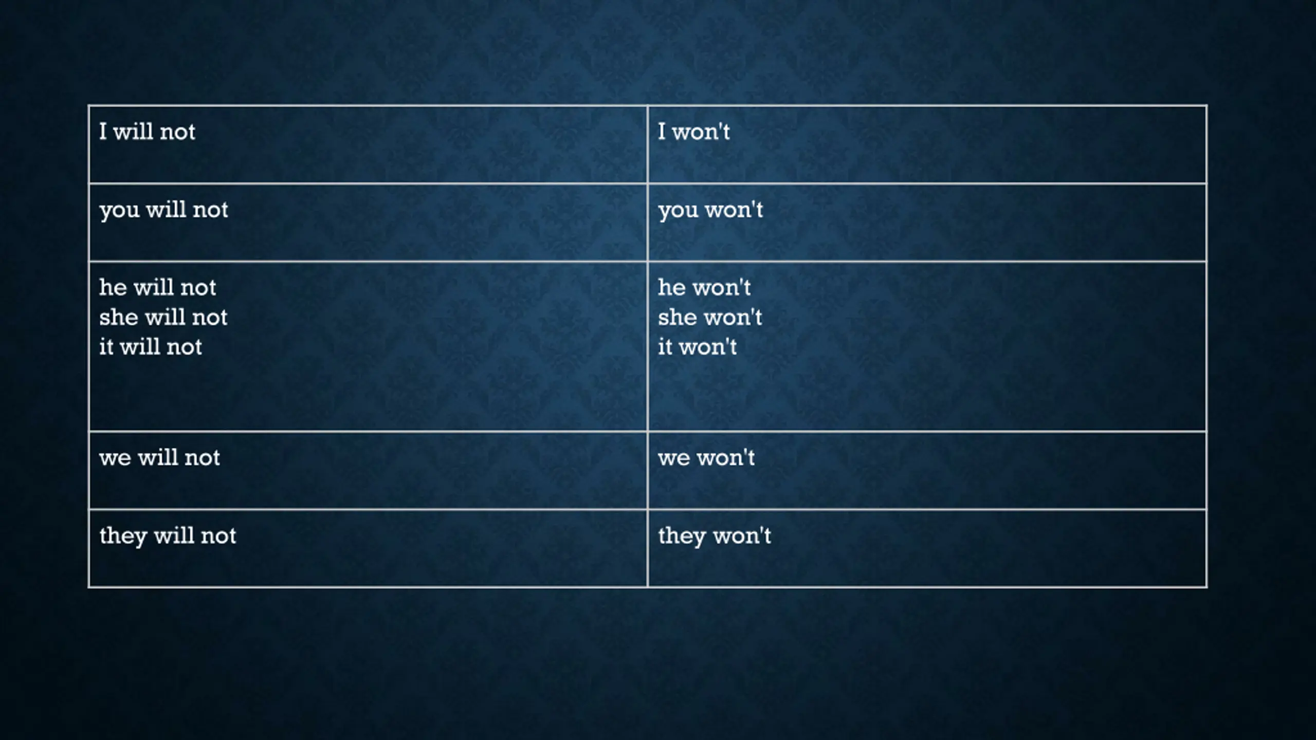 I will not I won't you will not you won't he will not she will not it will not he won't she won't it won't we will not we won't they will not they won't