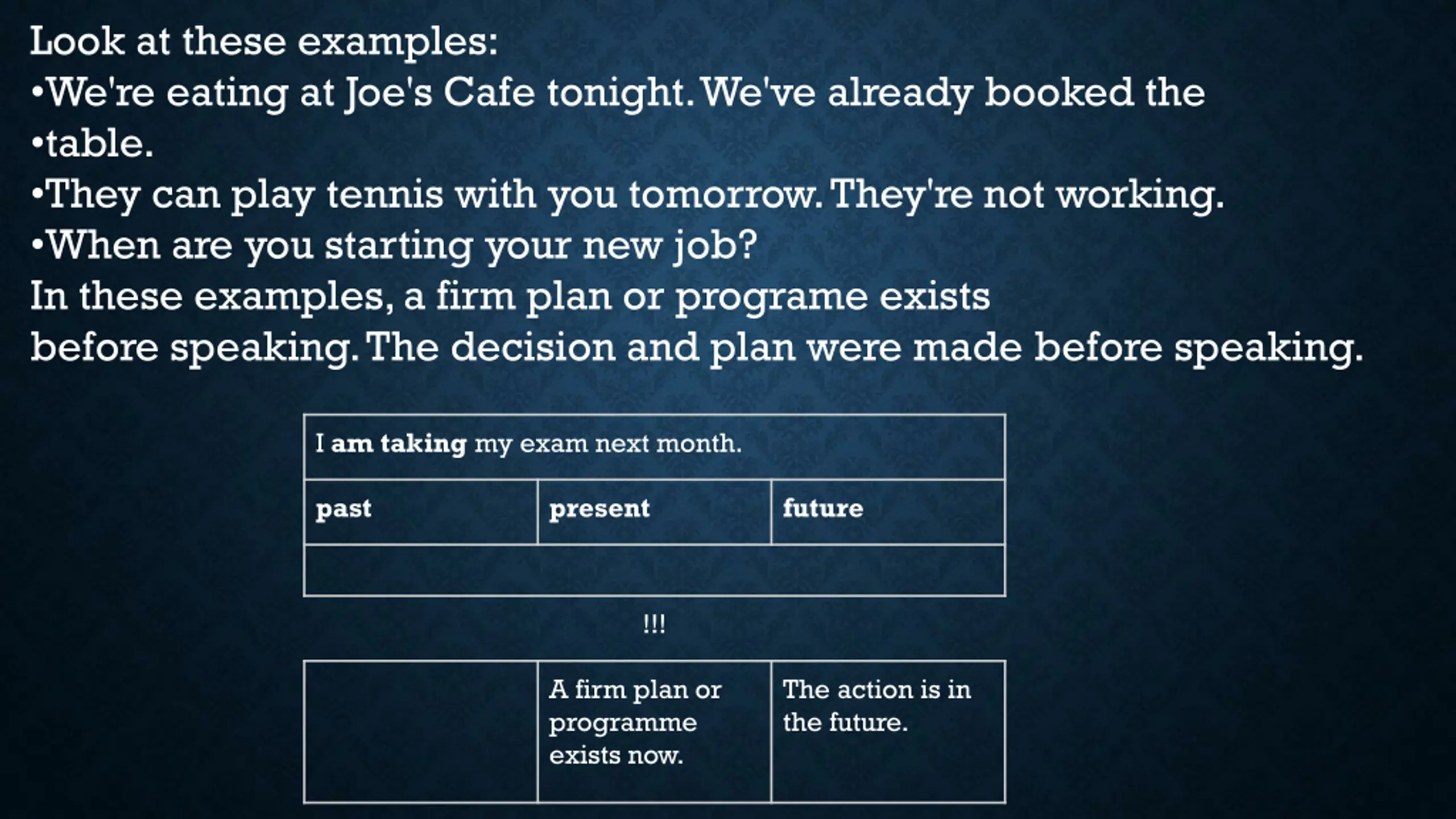 Look at these examples: We're eating at Joe's Cafe tonight. We've already booked the table. They can play tennis with you tomorrow. They're not working. When are you starting your new job? In these examples,a firm plan or programe exists before speaking. The decision and plan were made before speaking. I am taking my exam next month. past present future !!! A firm plan or programme exists now. The action is in the future.