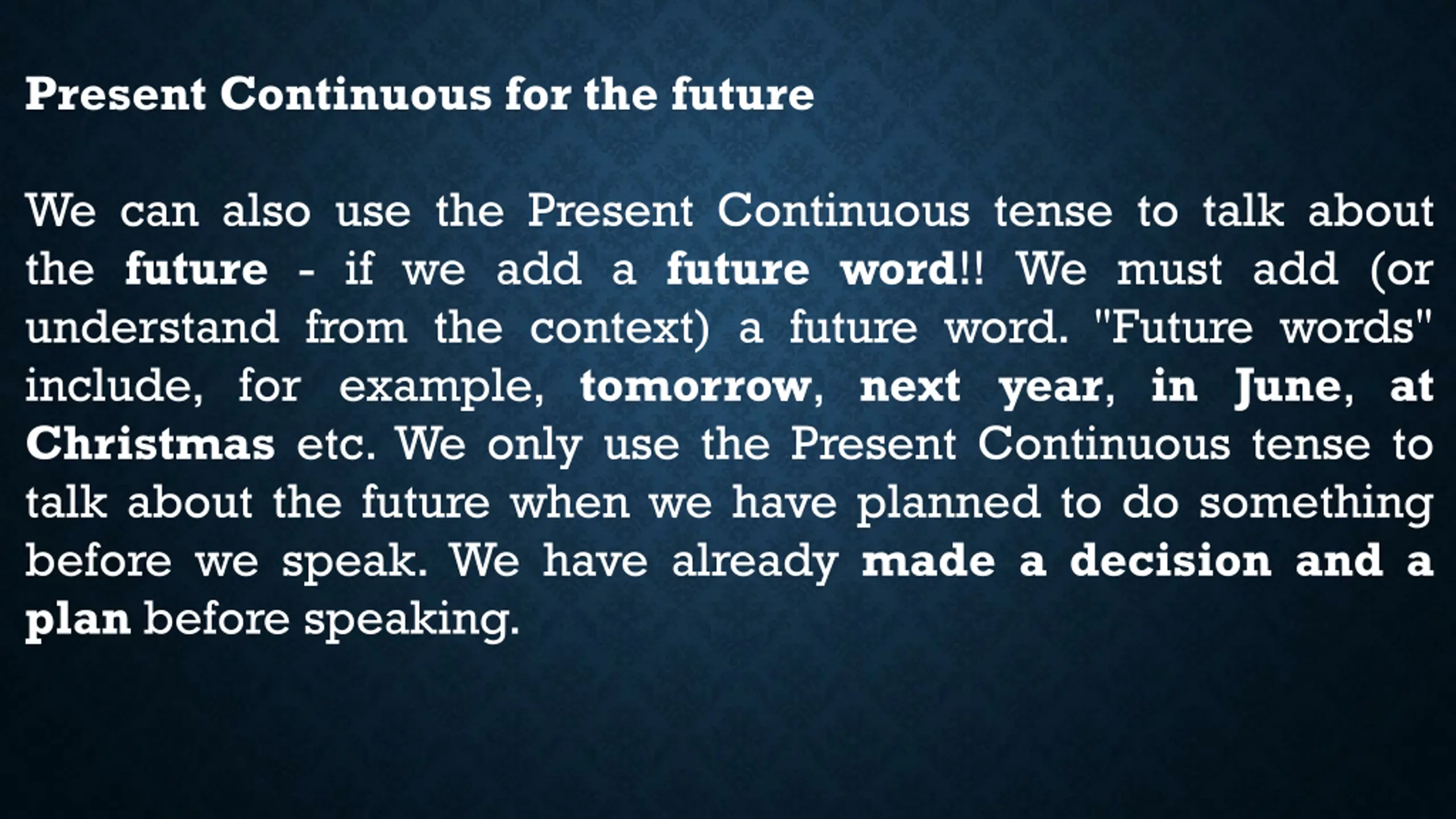Present Continuous for the future We can also use the Present Continuous tense to talk about the future - if we add a future word!! We must add (or understand from the context) a future word. "Future words" include, for example, tomorrow, next year, in June, at Christmas etc. We only use the Present Continuous tense to talk about the future when we have planned to do something before we speak. We have already made a decision and a plan before speaking.