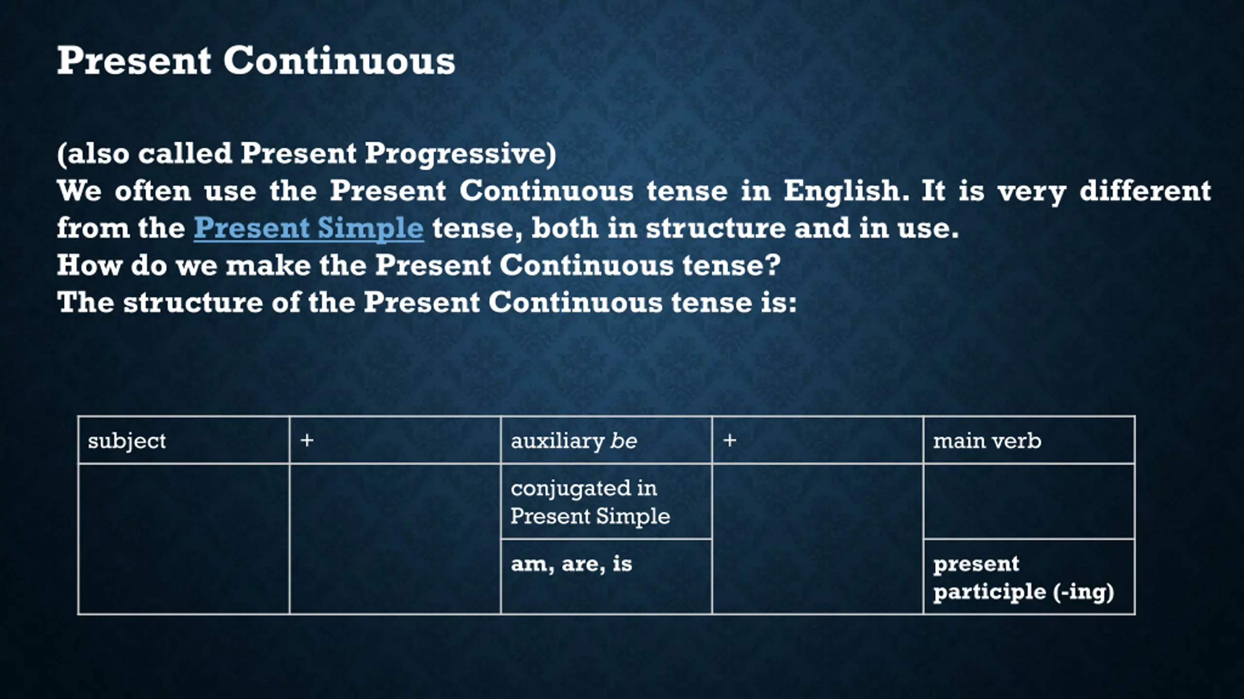 Present Continuous (also called Present Progressive) We often use the Present Continuous tense in English. It is very different from the Present Simple tense, both in structure and in use. How do we make the Present Continuous tense? The structure of the Present Continuous tense is: subject + auxiliary be + main verb conjugated in Present Simple am, are, is present participle (-ing)