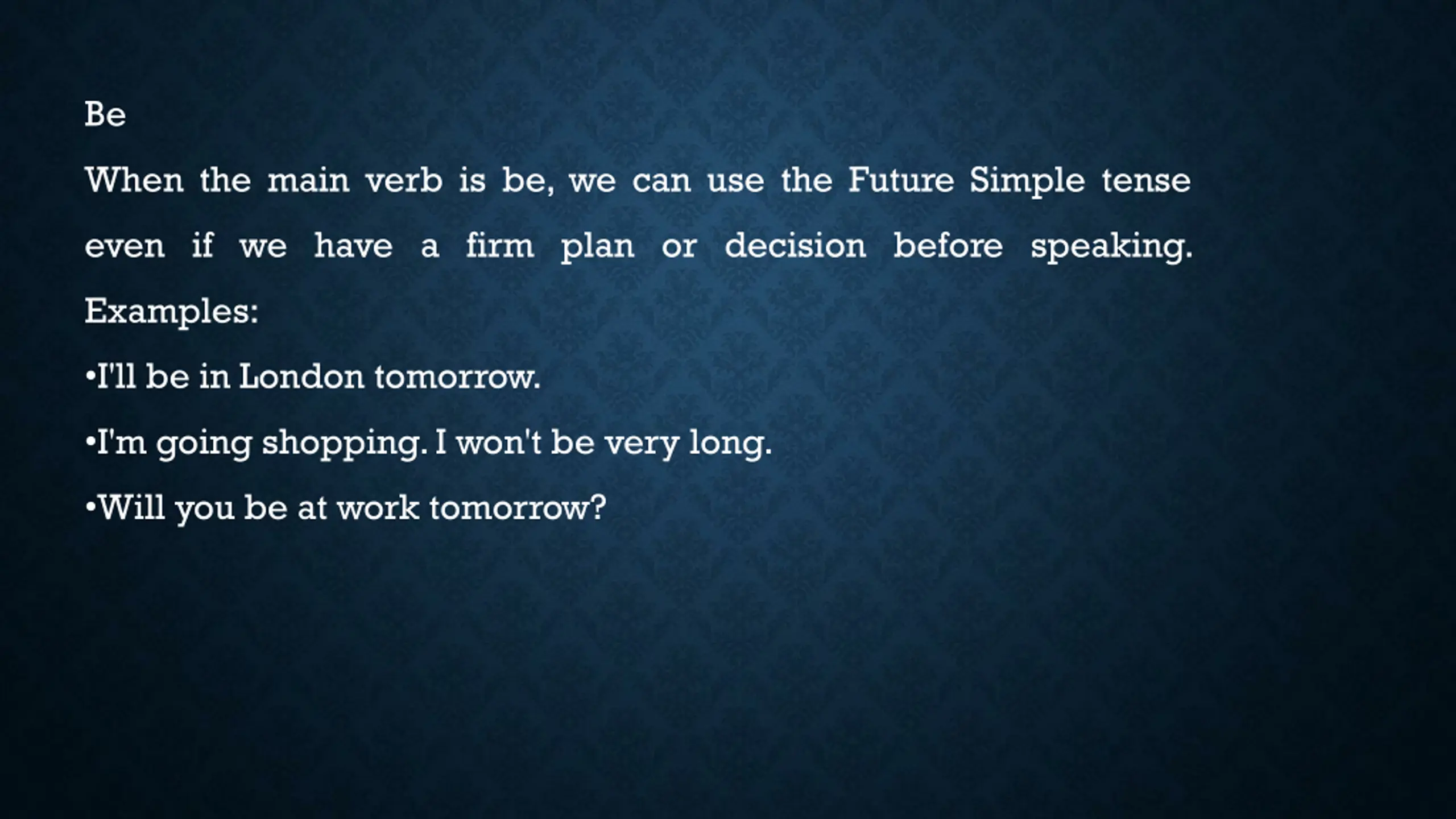 Be When the main verb is be, we can use the Future Simple tense even if we have a firm plan or decision before speaking. Examples: I'll be in London tomorrow. I'm going shopping. I won't be very long. Will you be at work tomorrow?