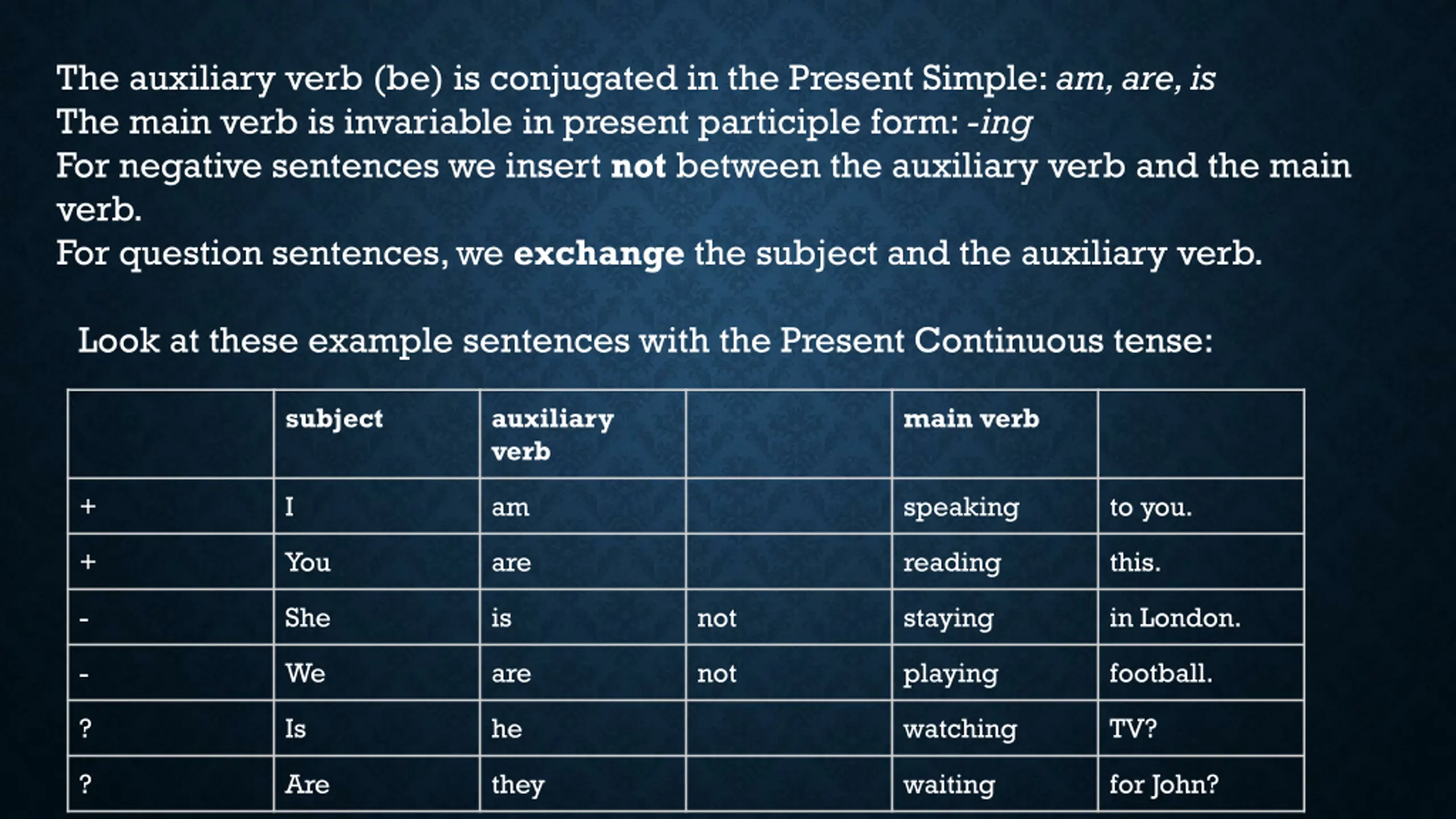 The auxiliary verb (be) is conjugated in the Present Simple:am, are, is The main verb is invariable in present participle form:-ing For negative sentences we insert not between the auxiliary verb and the main verb. For question sentences, we exchange the subject and the auxiliary verb. Look at these example sentences with the Present Continuous tense: subject auxiliary verb main verb + I am speaking to you. + You are reading this. - She is not staying in London. - We are not playing football. ? Is he watching TV? ? Are they waiting for John?