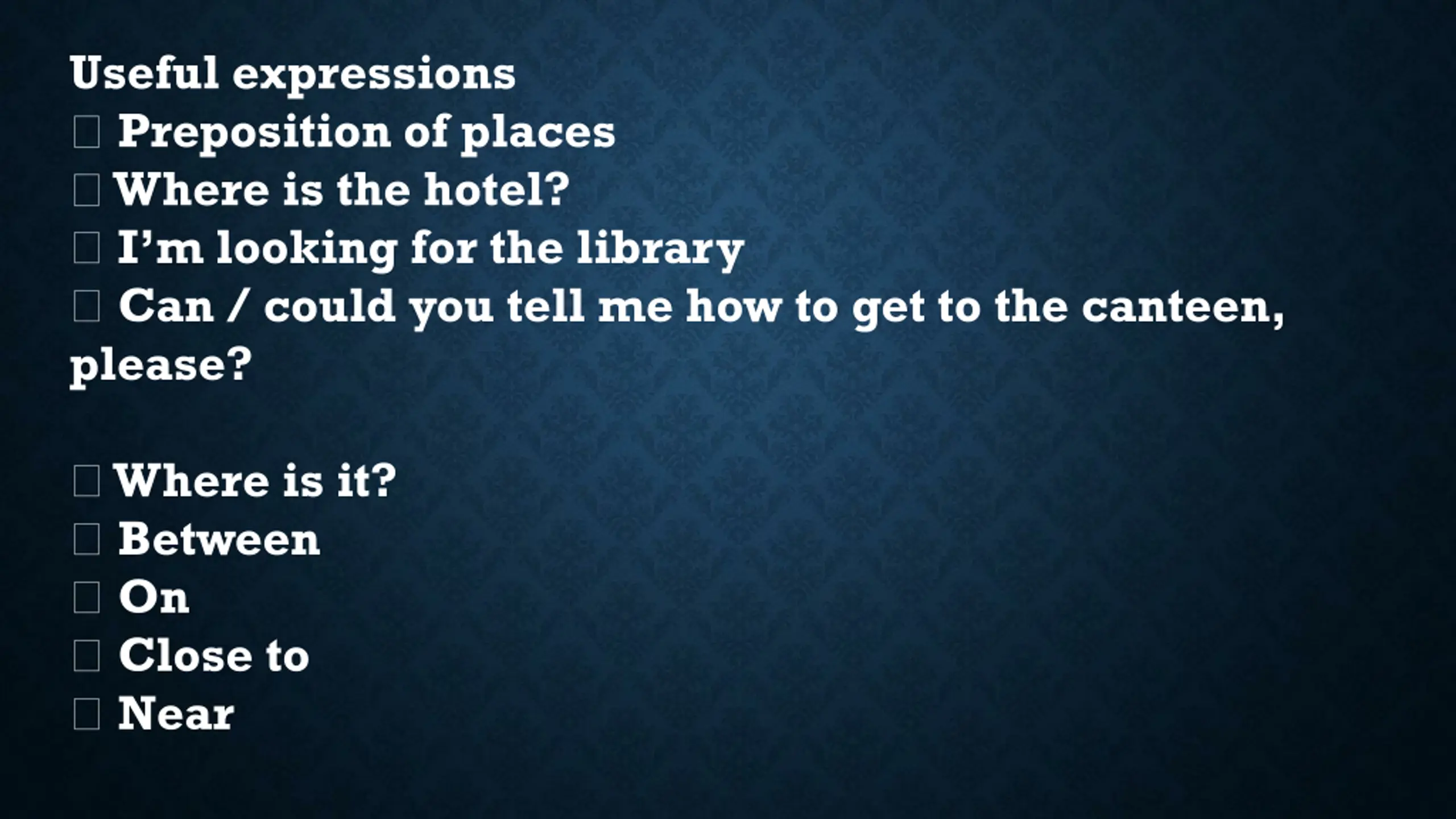Useful expressions Preposition of places Where is the hotel? I m looking for the library Can / could you tell me how to get to the canteen, please? Where is it? Between On Close to Near