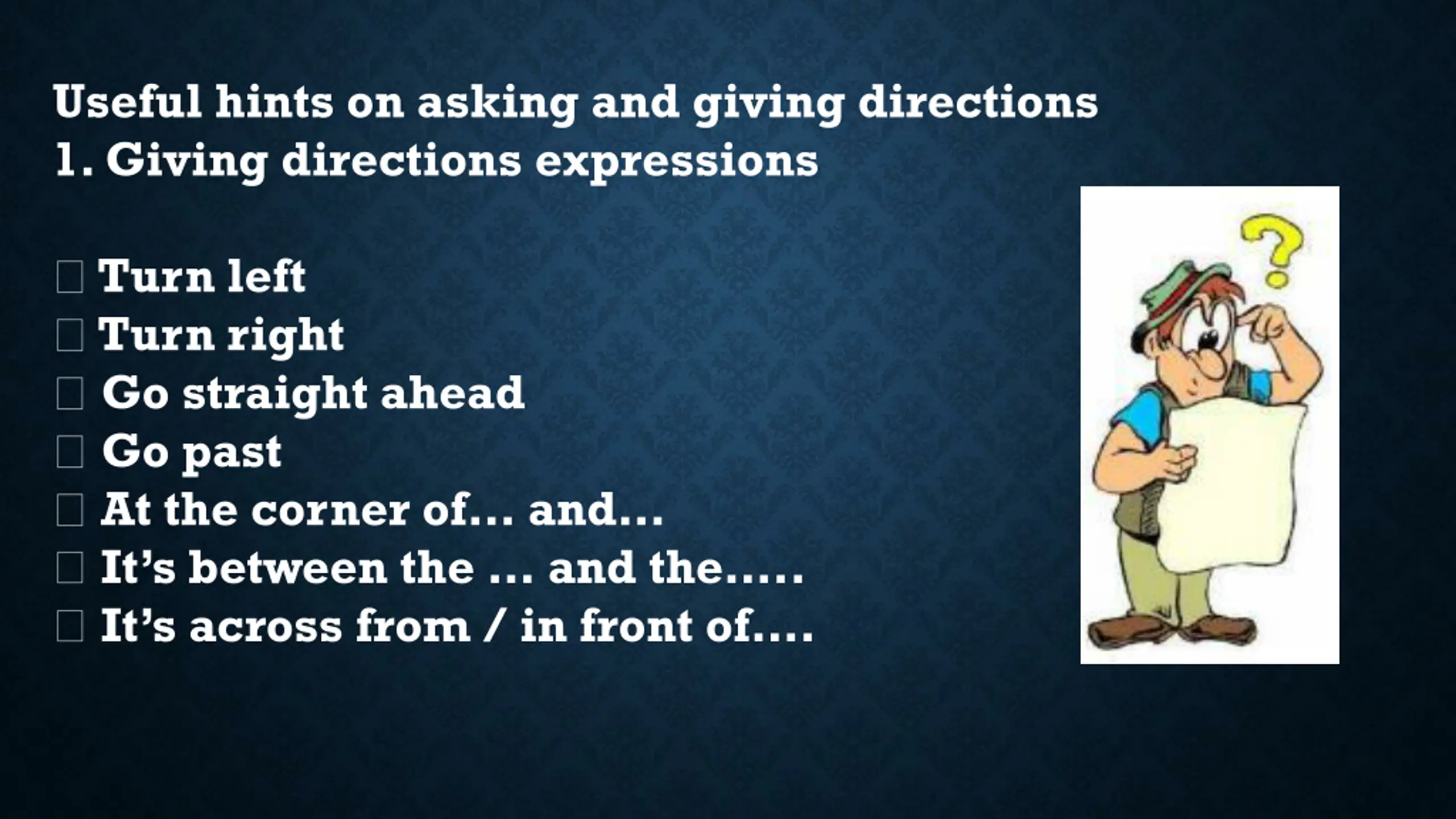 Useful hints on asking and giving directions 1. Giving directions expressions Turn left Turn right Go straight ahead Go past At the corner of and It s between the and the .. It s across from / in front of .