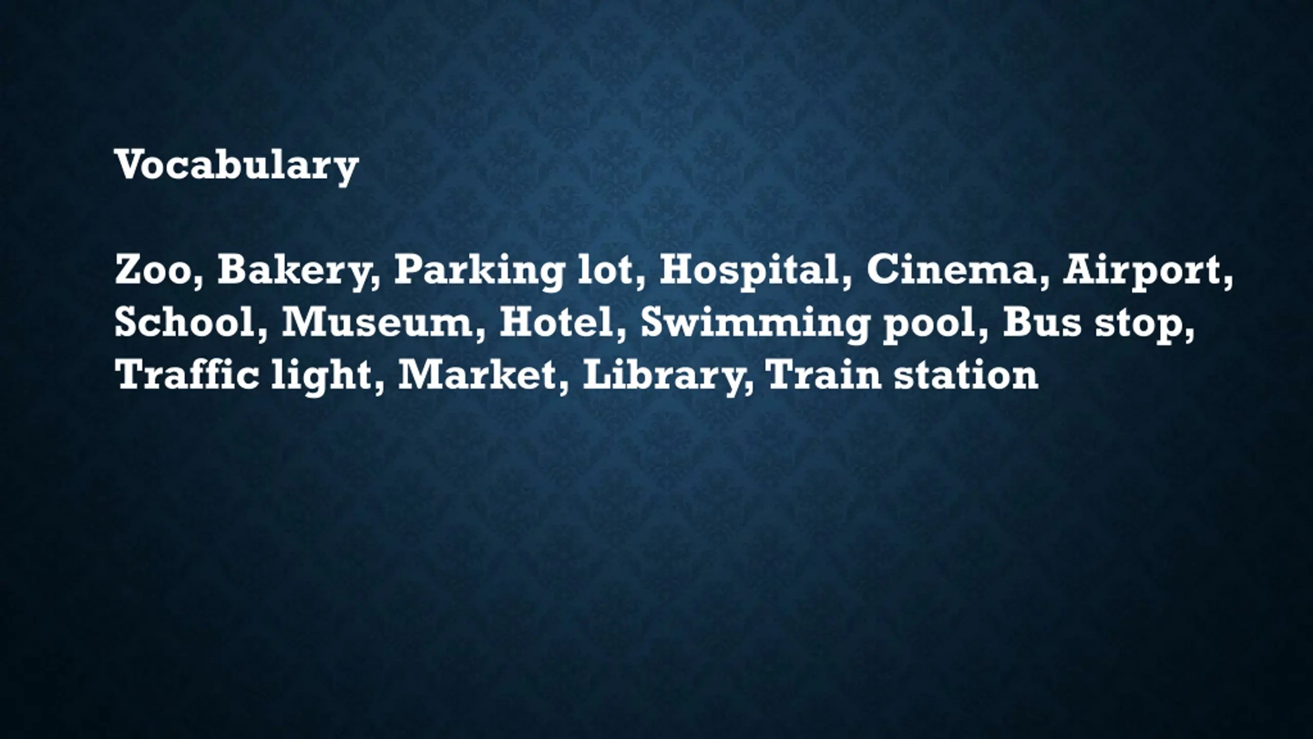 Vocabulary Zoo, Bakery, Parking lot, Hospital, Cinema, Airport, School, Museum, Hotel, Swimming pool, Bus stop, Traffic light, Market, Library, Train station