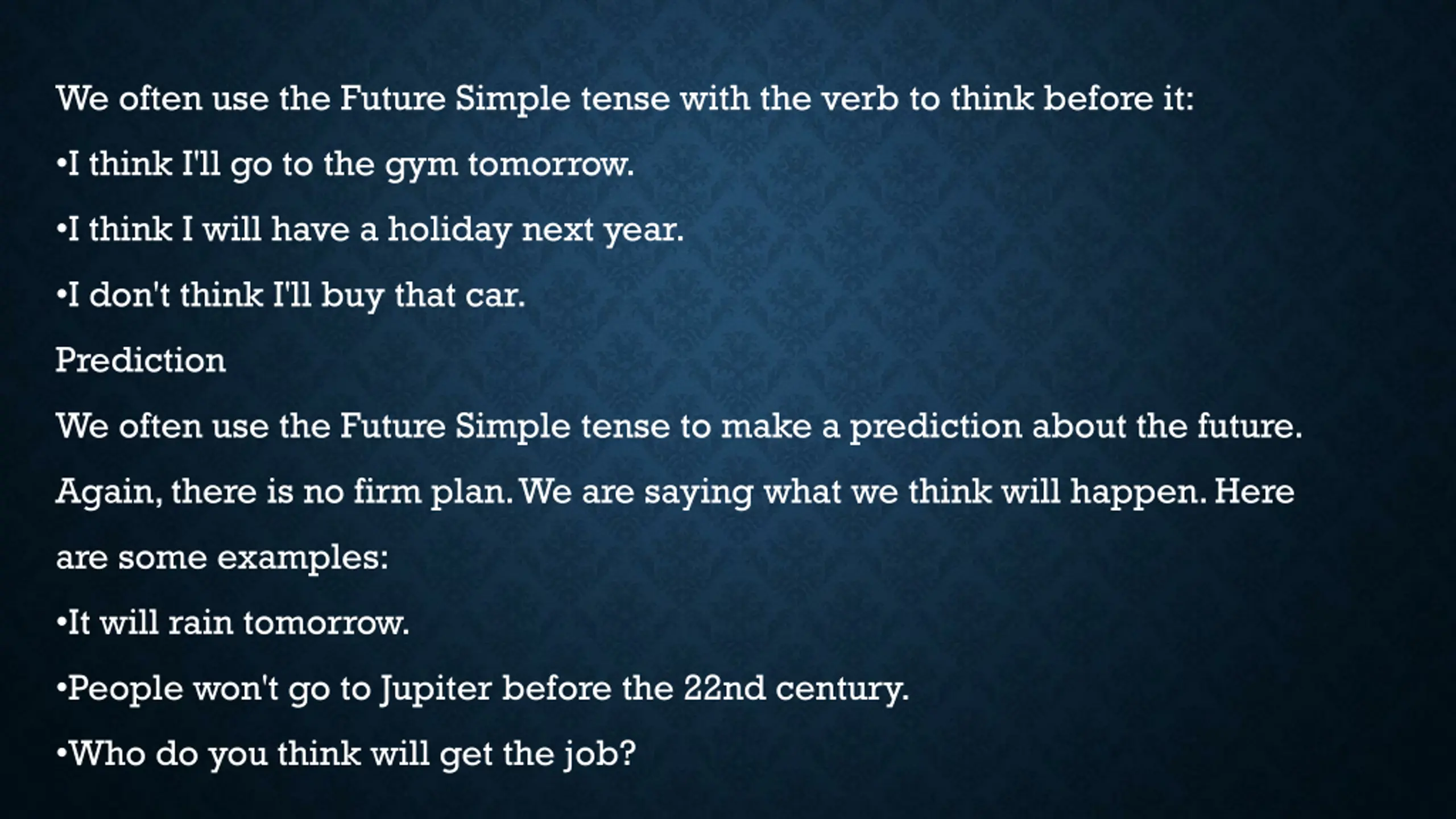 We often use the Future Simple tense with the verb to think before it: I think I'll go to the gym tomorrow. I think I will have a holiday next year. I don't think I'll buy that car. Prediction We often use the Future Simple tense to make a prediction about the future. Again, there is no firm plan. We are saying what we think will happen. Here are some examples: It will rain tomorrow. People won't go to Jupiter before the 22nd century. Who do you think will get the job?