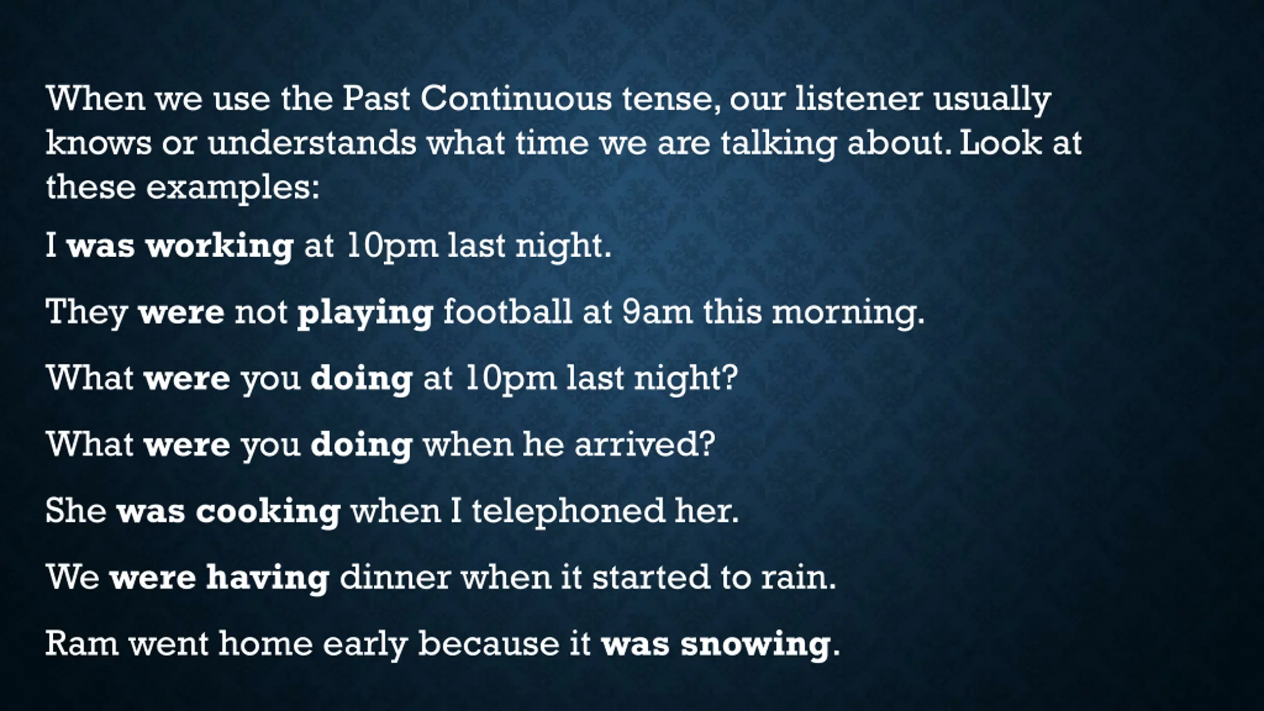 When we use the Past Continuous tense, our listener usually knows or understands what time we are talking about. Look at these examples: I was working at 10pm last night. They were not playing football at 9am this morning. What were you doing at 10pm last night? What were you doing when he arrived? She was cooking when I telephoned her. We were having dinner when it started to rain. Ram went home early because it was snowing.
