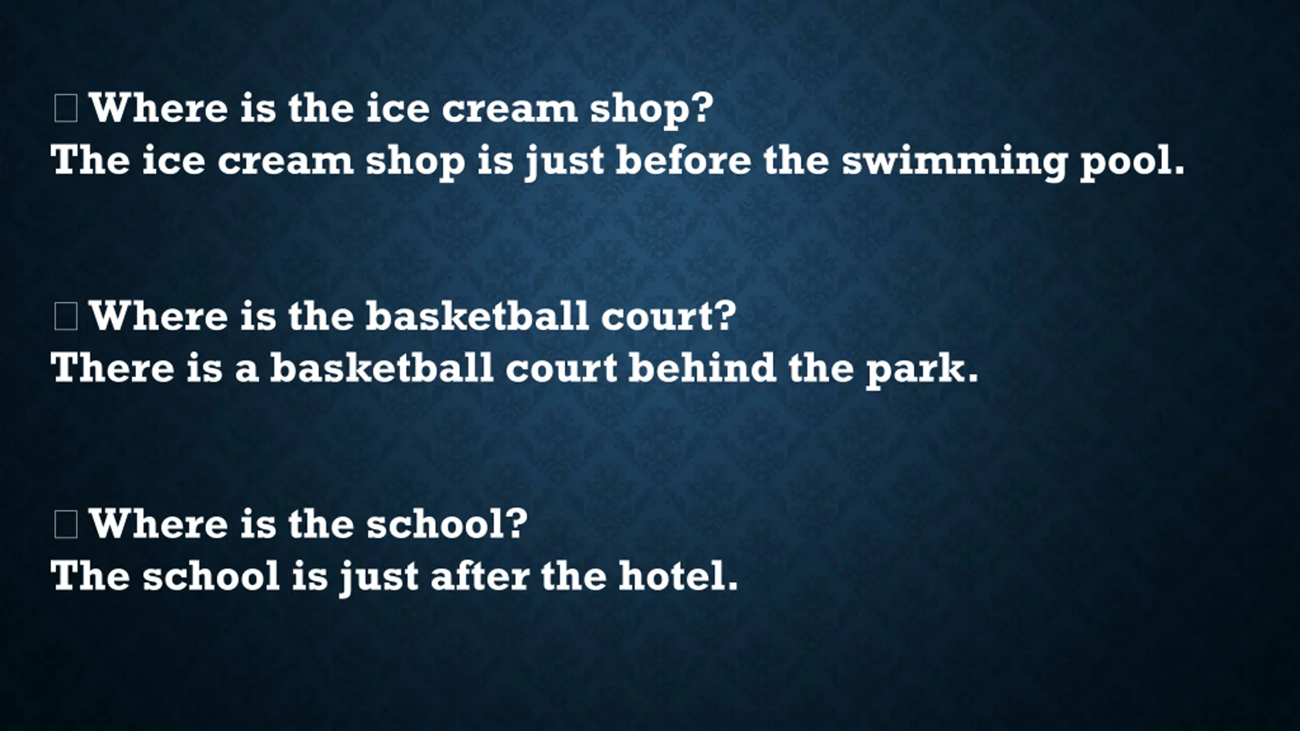 Where is the ice cream shop? The ice cream shop is just before the swimming pool. Where is the basketball court? There is a basketball court behind the park. Where is the school? The school is just after the hotel.