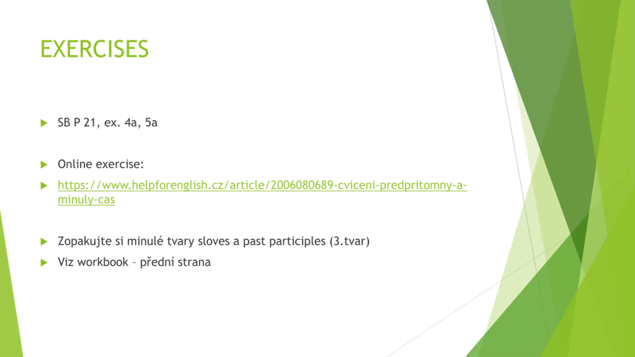 EXERCISES SB P 21, ex. 4a, 5a Online exercise: https://www.helpforenglish.cz/article/2006080689-cviceni-predpritomny-a- minuly-cas Zopakujte si minul tvary sloves a past participles (3.tvar) Viz workbook p edn strana