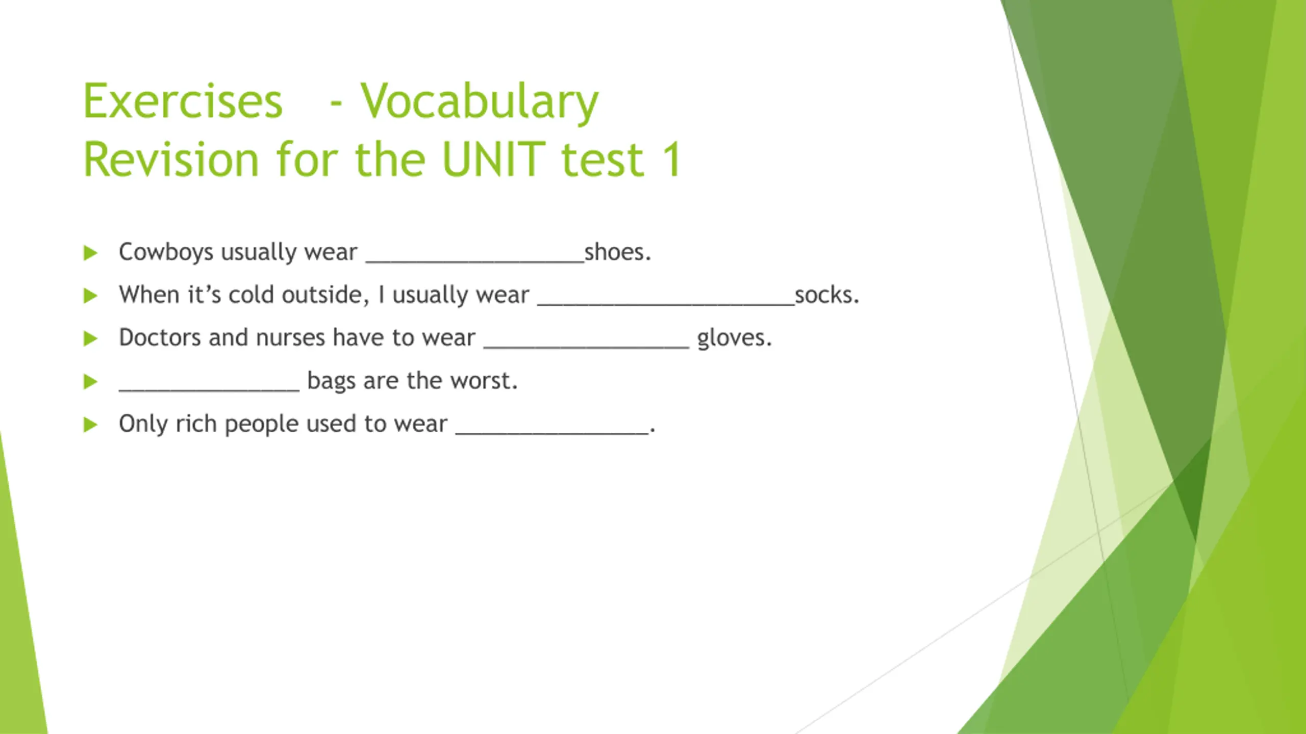 Exercises - Vocabulary Revision for the UNIT test 1 Cowboys usually wear _________________shoes. When it s cold outside, I usually wear ____________________socks. Doctors and nurses have to wear ________________ gloves. ______________ bags are the worst. Only rich people used to wear _______________.