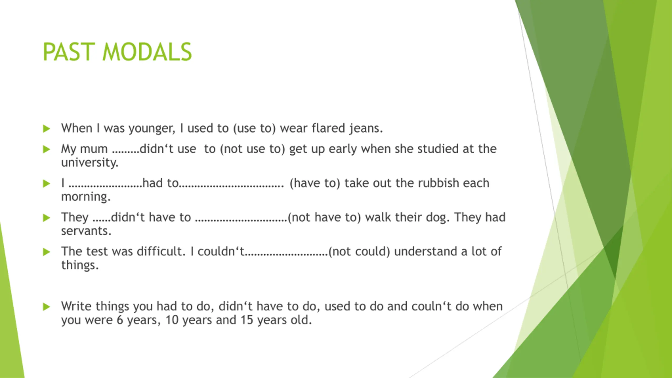 PAST MODALS When I was younger, I used to (use to) wear flared jeans. My mum didn t use to (not use to) get up early when she studied at the university. I had to . (have to) take out the rubbish each morning. They didn t have to (not have to) walk their dog. They had servants. The test was difficult. I couldn t (not could) understand a lot of things. Write things you had to do, didn t have to do, used to do and couln t do when you were 6 years, 10 years and 15 years old.