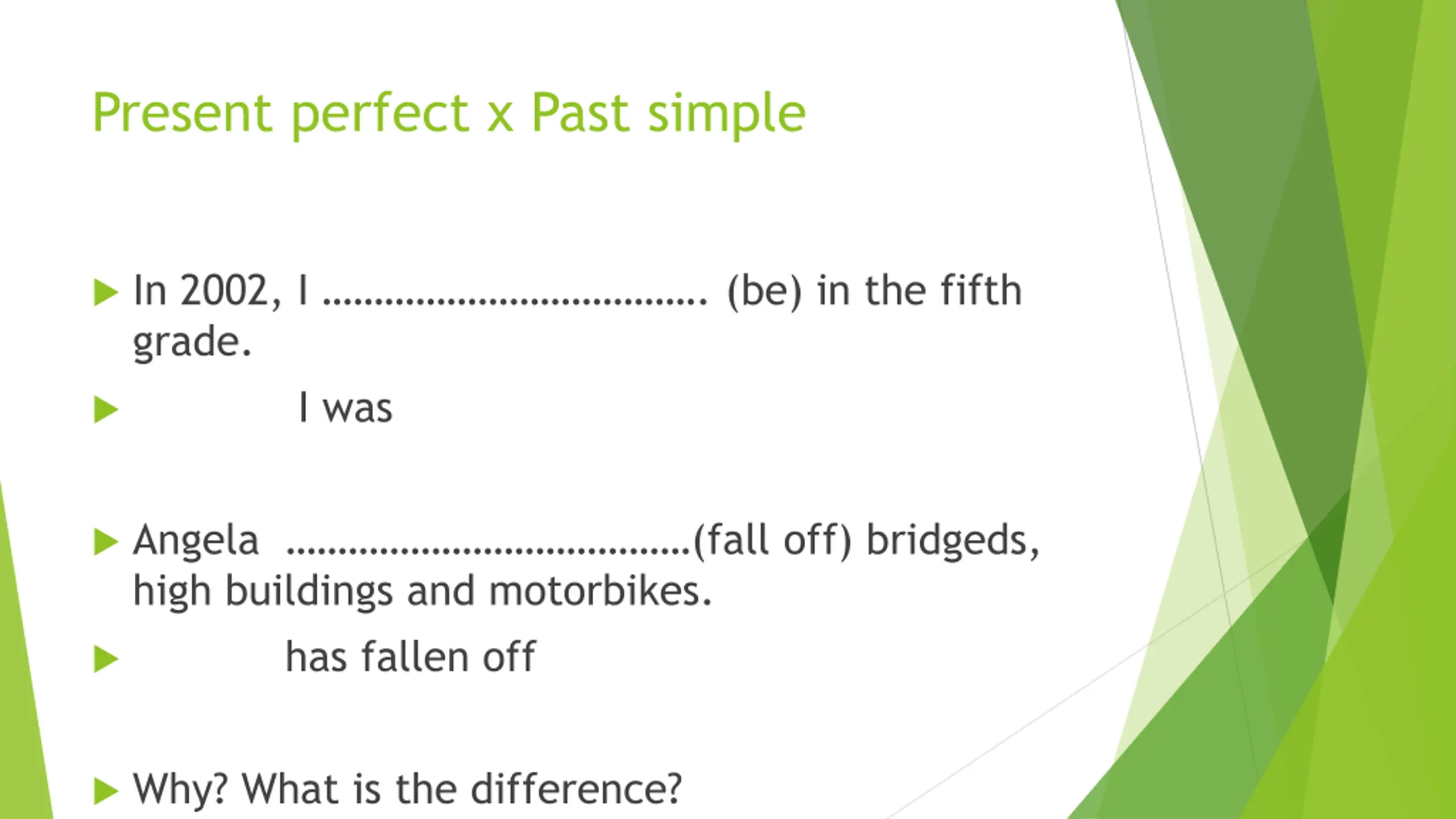 Present perfect x Past simple In 2002, I . (be) in the fifth grade. I was Angela (fall off) bridgeds, high buildings and motorbikes. has fallen off Why? What is the difference?