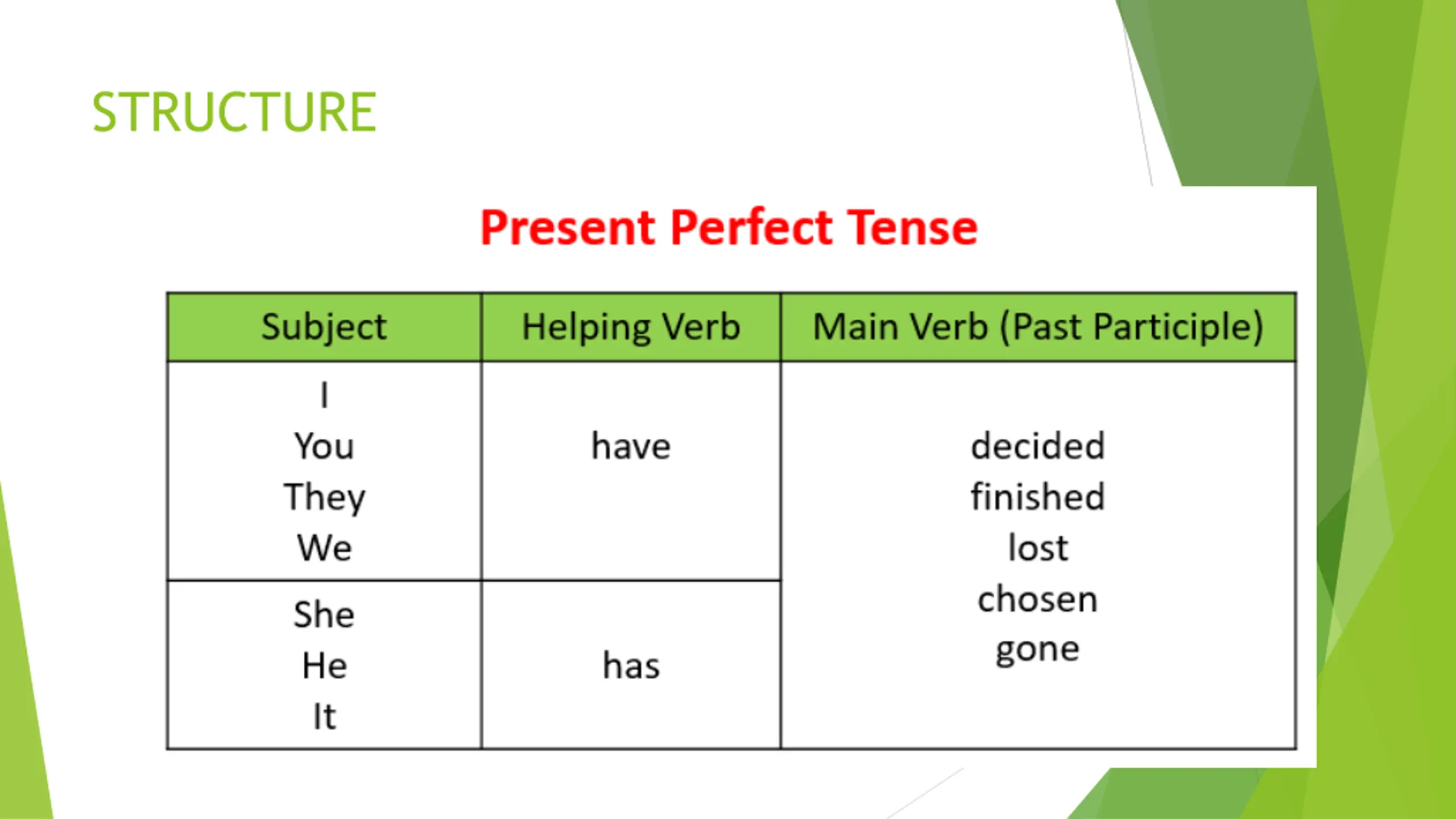 How do we make present perfect? HAVE/HAS Pomocn sloveso Past participle t et tvar Fallen, gone, decided, arrived