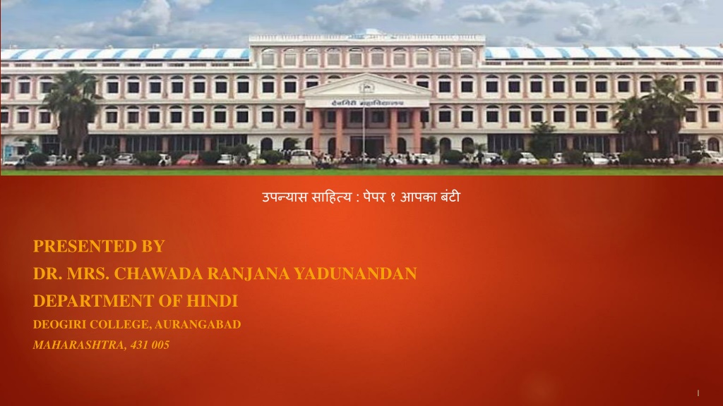 : PRESENTED BY DR. MRS. CHAWADA RANJANA YADUNANDAN DEPARTMENT OF HINDI DEOGIRI COLLEGE, AURANGABAD MAHARASHTRA, 431 005 1