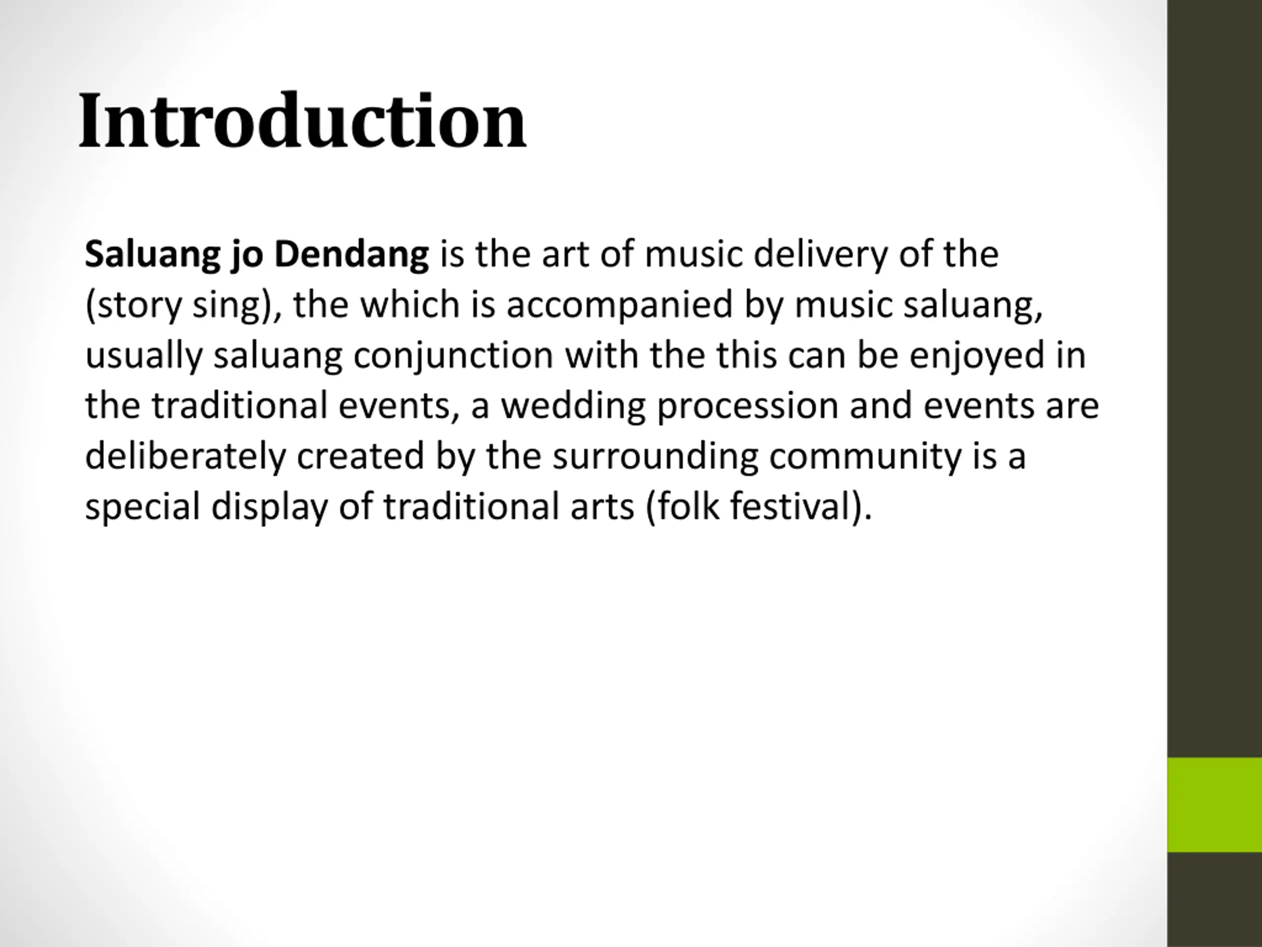 Introduction Saluang jo Dendang is the art of music delivery of the (story sing), the which is accompanied by music saluang, usually saluang conjunction with the this can be enjoyed in the traditional events, a wedding procession and events are deliberately created by the surrounding community is a special display of traditional arts (folk festival).