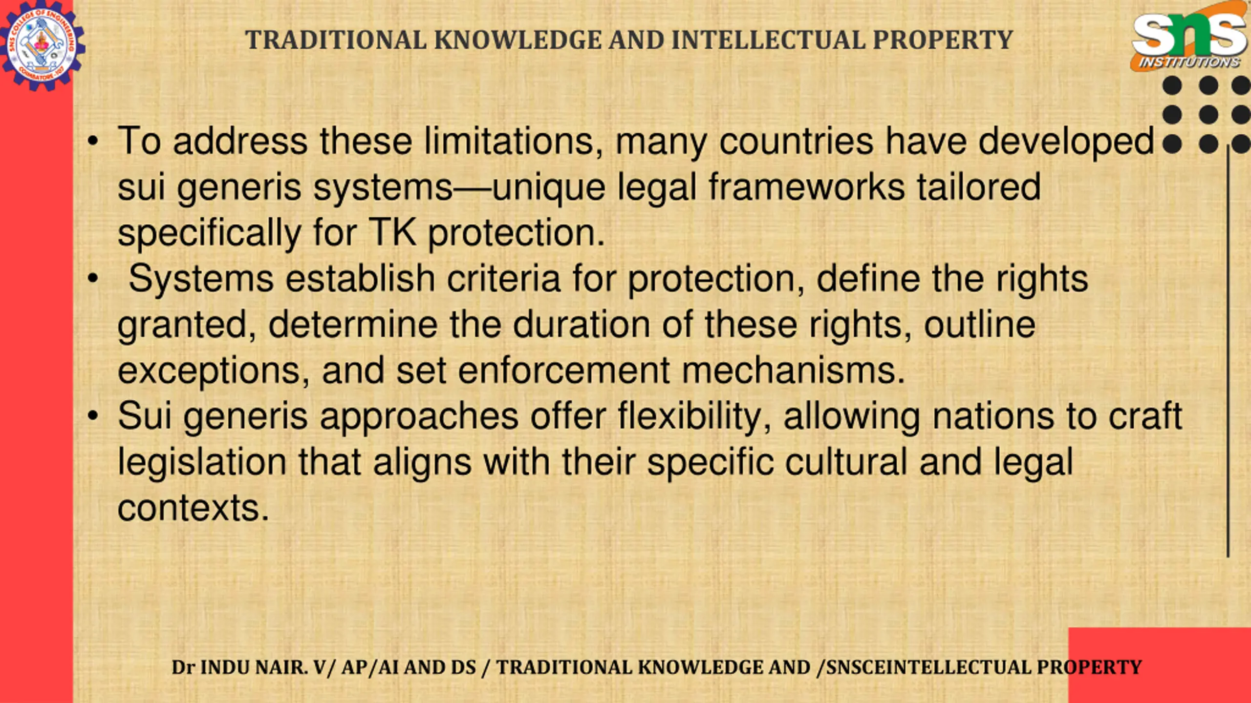 TRADITIONAL KNOWLEDGE AND INTELLECTUAL PROPERTY To address these limitations, many countries have developed sui generis systems unique legal frameworks tailored specifically for TK protection. Systems establish criteria for protection, define the rights granted, determine the duration of these rights, outline exceptions, and set enforcement mechanisms. Sui generis approaches offer flexibility, allowing nations to craft legislation that aligns with their specific cultural and legal contexts. Dr INDU NAIR. V/ AP/AI AND DS / TRADITIONAL KNOWLEDGE AND /SNSCEINTELLECTUAL PROPERTY