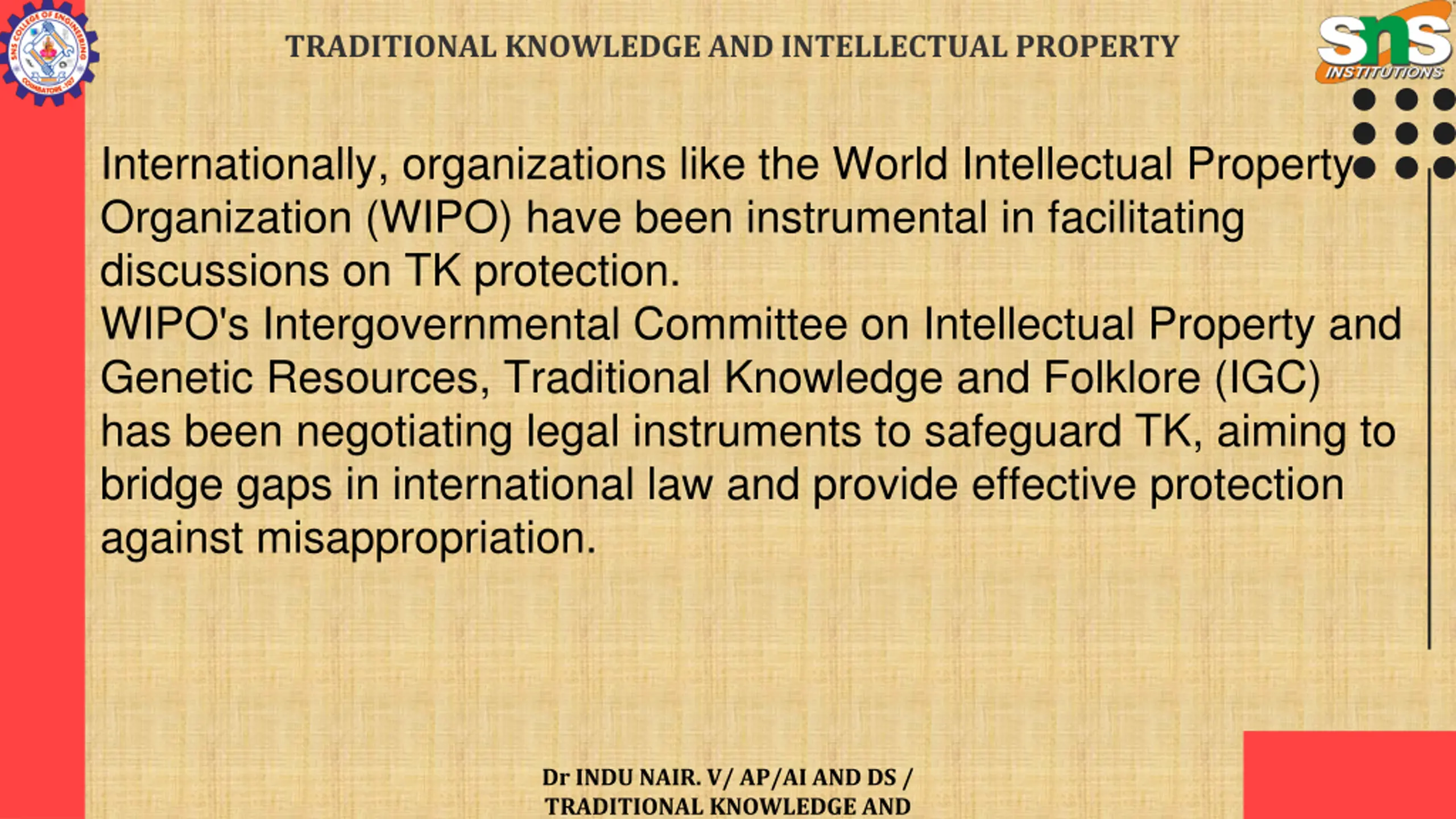 TRADITIONAL KNOWLEDGE AND INTELLECTUAL PROPERTY Internationally, organizations like the World Intellectual Property Organization (WIPO) have been instrumental in facilitating discussions on TK protection. WIPO's Intergovernmental Committee on Intellectual Property and Genetic Resources, Traditional Knowledge and Folklore (IGC) has been negotiating legal instruments to safeguard TK, aiming to bridge gaps in international law and provide effective protection against misappropriation. Dr INDU NAIR. V/ AP/AI AND DS / TRADITIONAL KNOWLEDGE AND