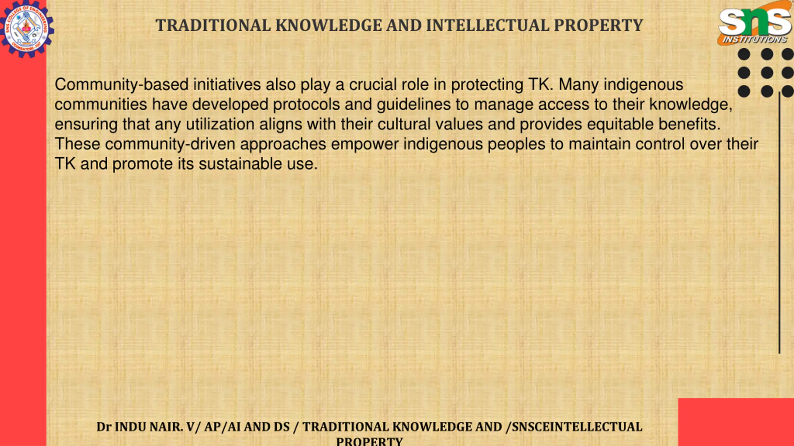 TRADITIONAL KNOWLEDGE AND INTELLECTUAL PROPERTY Community-based initiatives also play a crucial role in protecting TK. Many indigenous communities have developed protocols and guidelines to manage access to their knowledge, ensuring that any utilization aligns with their cultural values and provides equitable benefits. These community-driven approaches empower indigenous peoples to maintain control over their TK and promote its sustainable use. Dr INDU NAIR. V/ AP/AI AND DS / TRADITIONAL KNOWLEDGE AND /SNSCEINTELLECTUAL PROPERTY