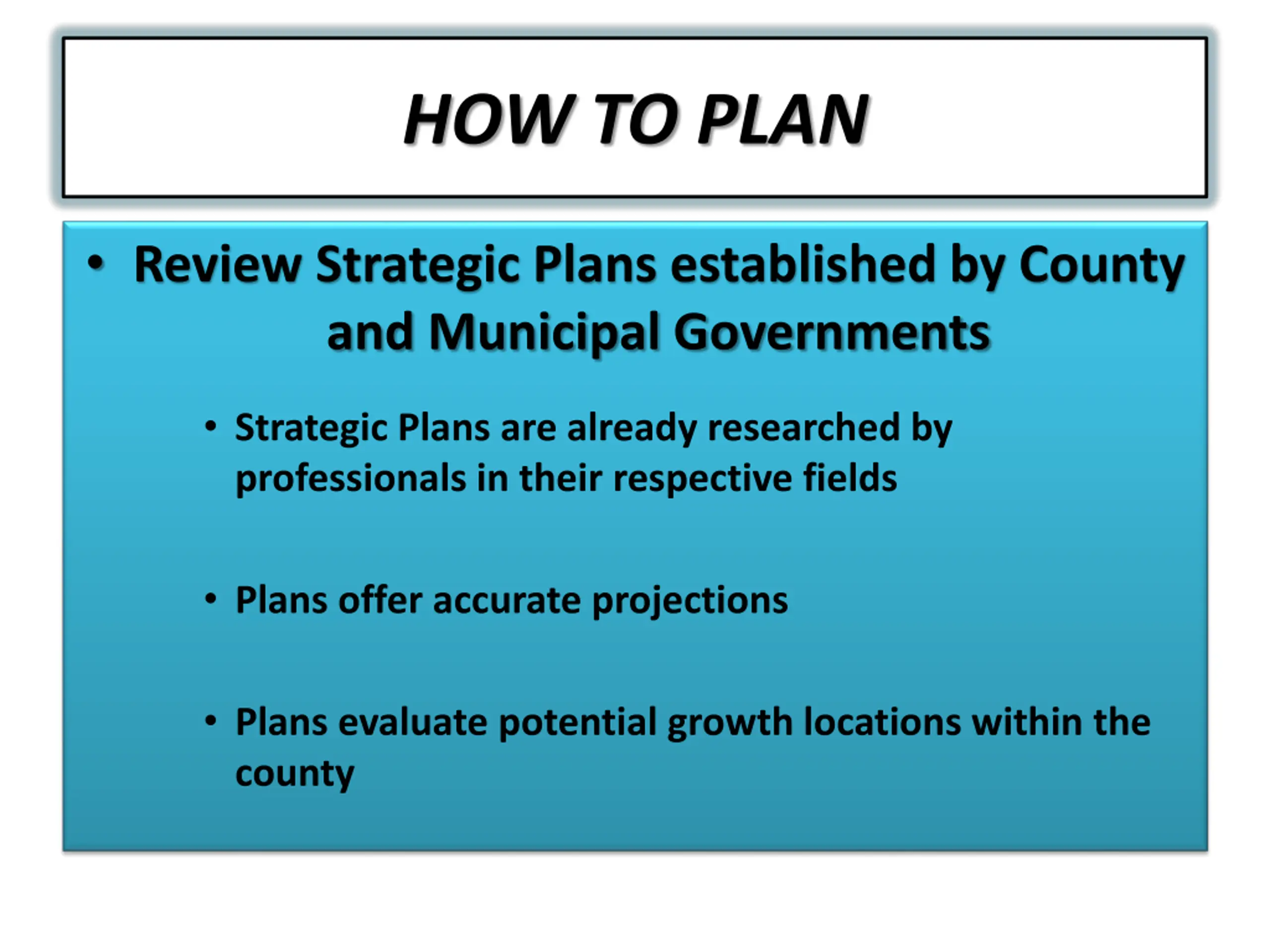 HOW TO PLAN Review Strategic Plans established by County and Municipal Governments Strategic Plans are already researched by professionals in their respective fields Plans offer accurate projections Plans evaluate potential growth locations within the county