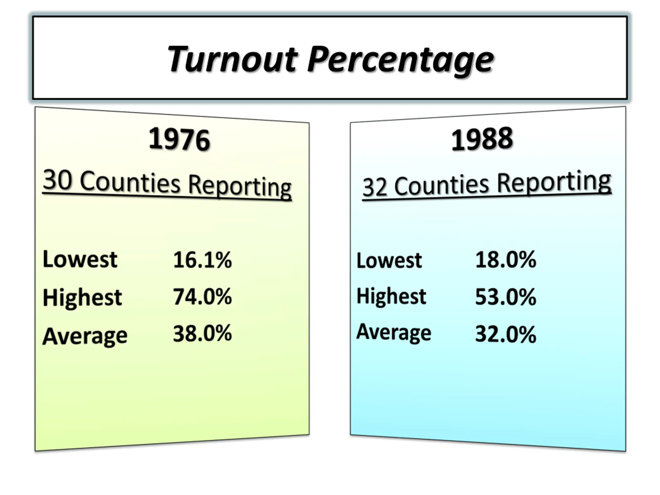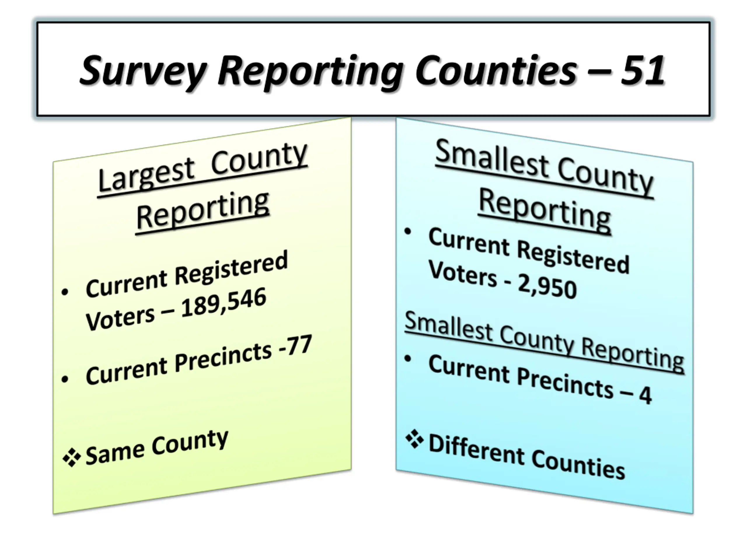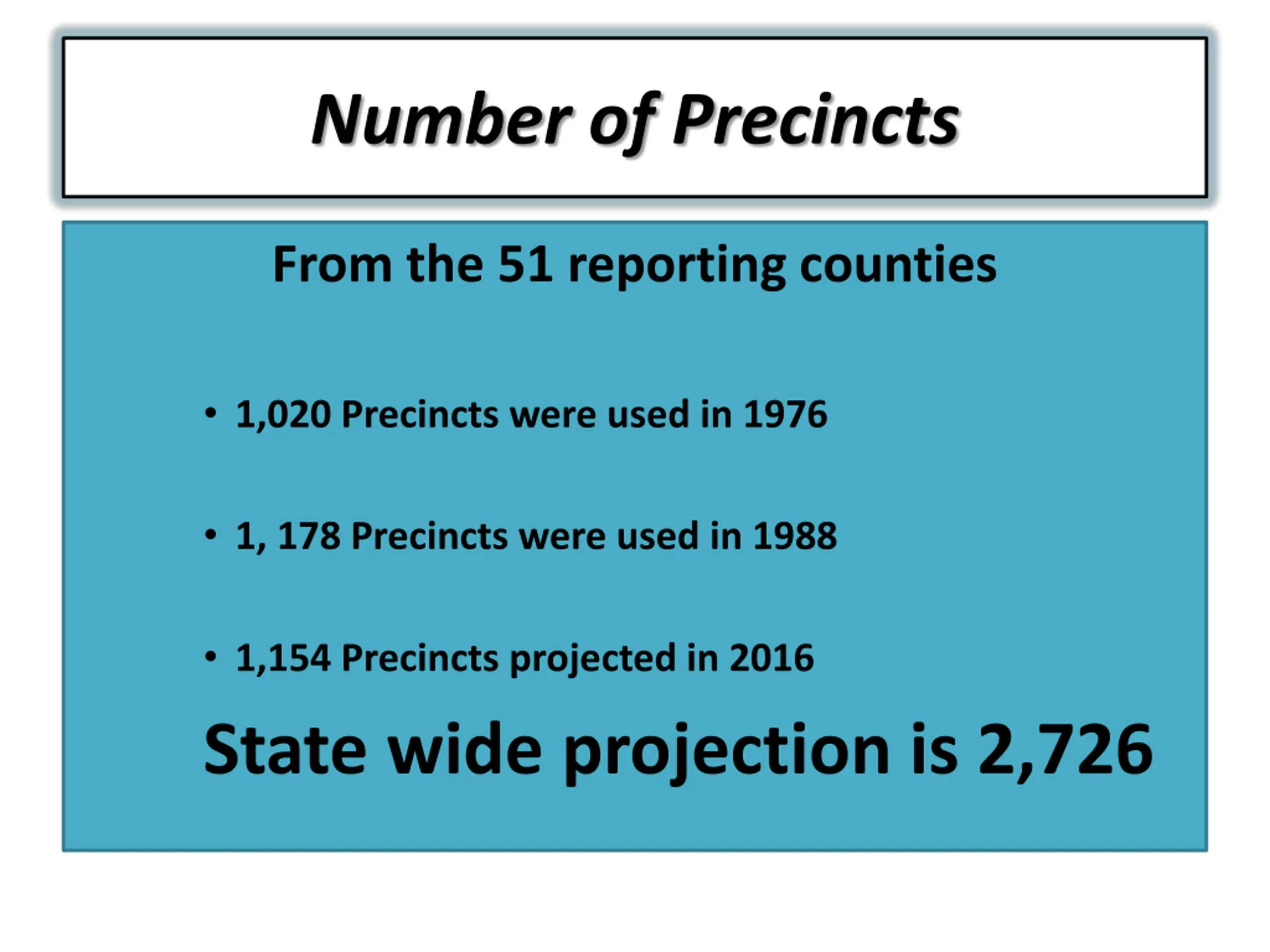 Number of Precincts From the 51 reporting counties 1,020 Precincts were used in 1976 1, 178 Precincts were used in 1988 1,154 Precincts projected in 2016 State wide projection is 2,726