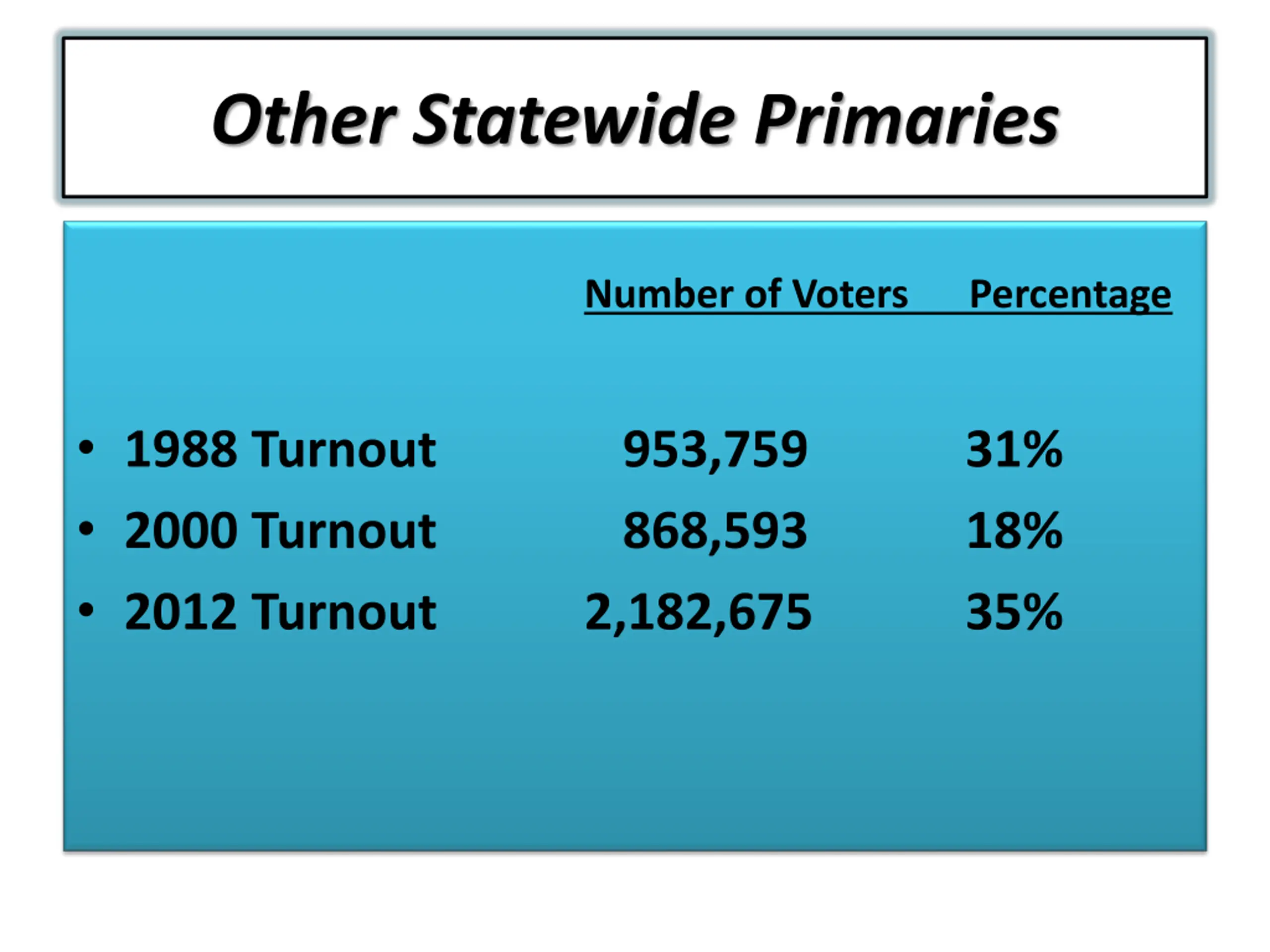 Other Statewide Primaries Number of Voters Percentage 1988 Turnout 2000 Turnout 2012 Turnout 953,759 868,593 2,182,675 31% 18% 35%