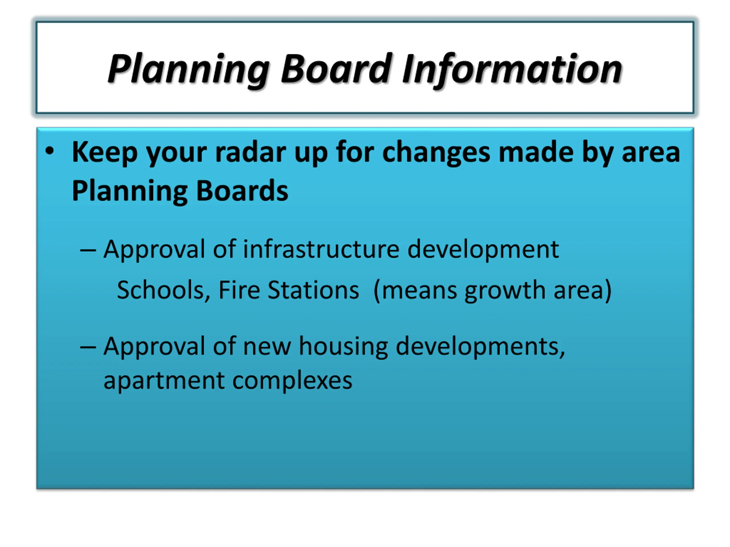 Planning Board Information Keep your radar up for changes made by area Planning Boards Approval of infrastructure development Schools, Fire Stations (means growth area) Approval of new housing developments, apartment complexes