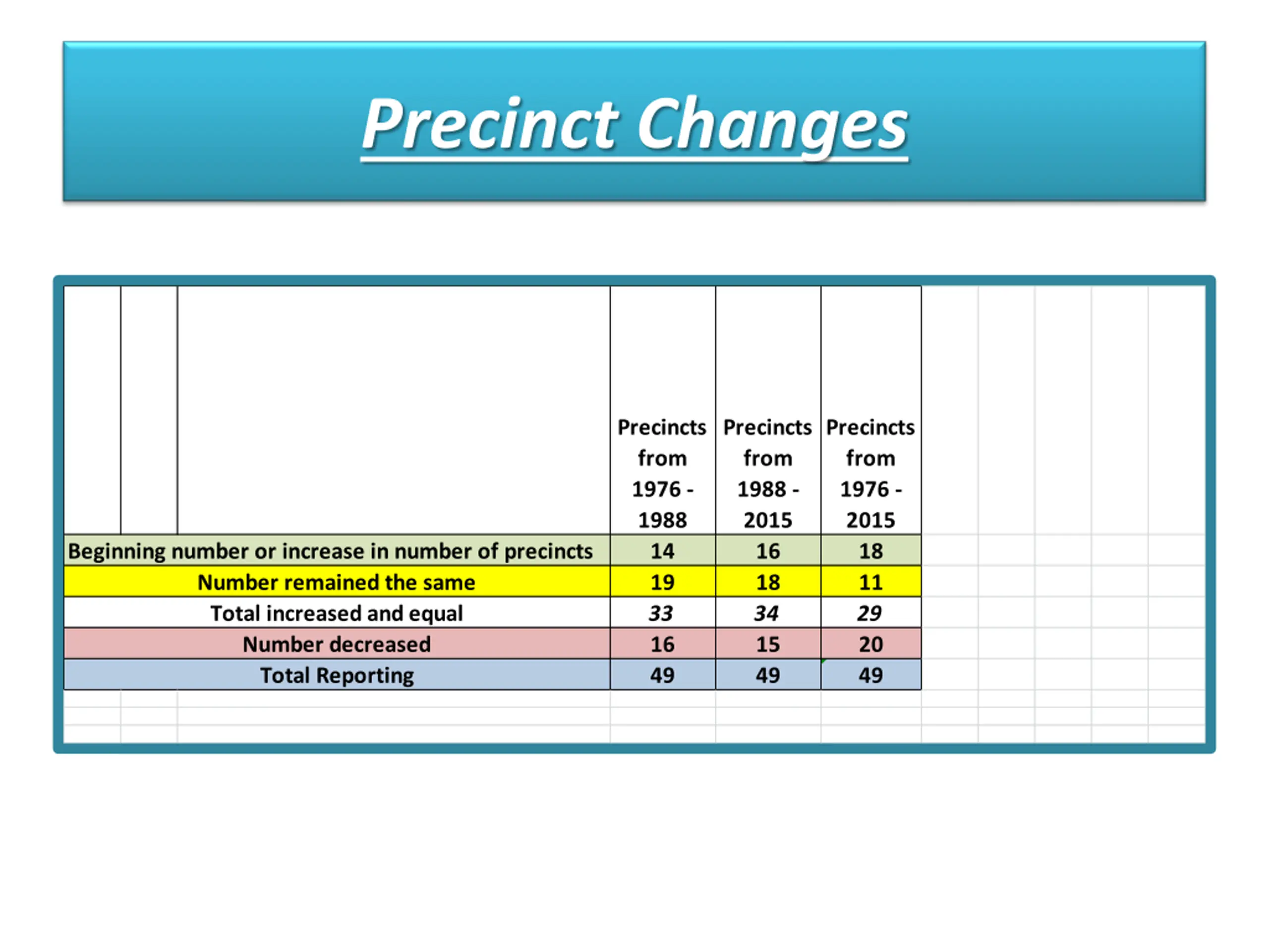 Precinct Changes Precincts from 1976 - 1988 14 19 33 16 49 Precincts from 1988 - 2015 16 18 34 15 49 Precincts from 1976 - 2015 18 11 29 20 49 Beginning number or increase in number of precincts Number remained the same Total increased and equal Number decreased Total Reporting