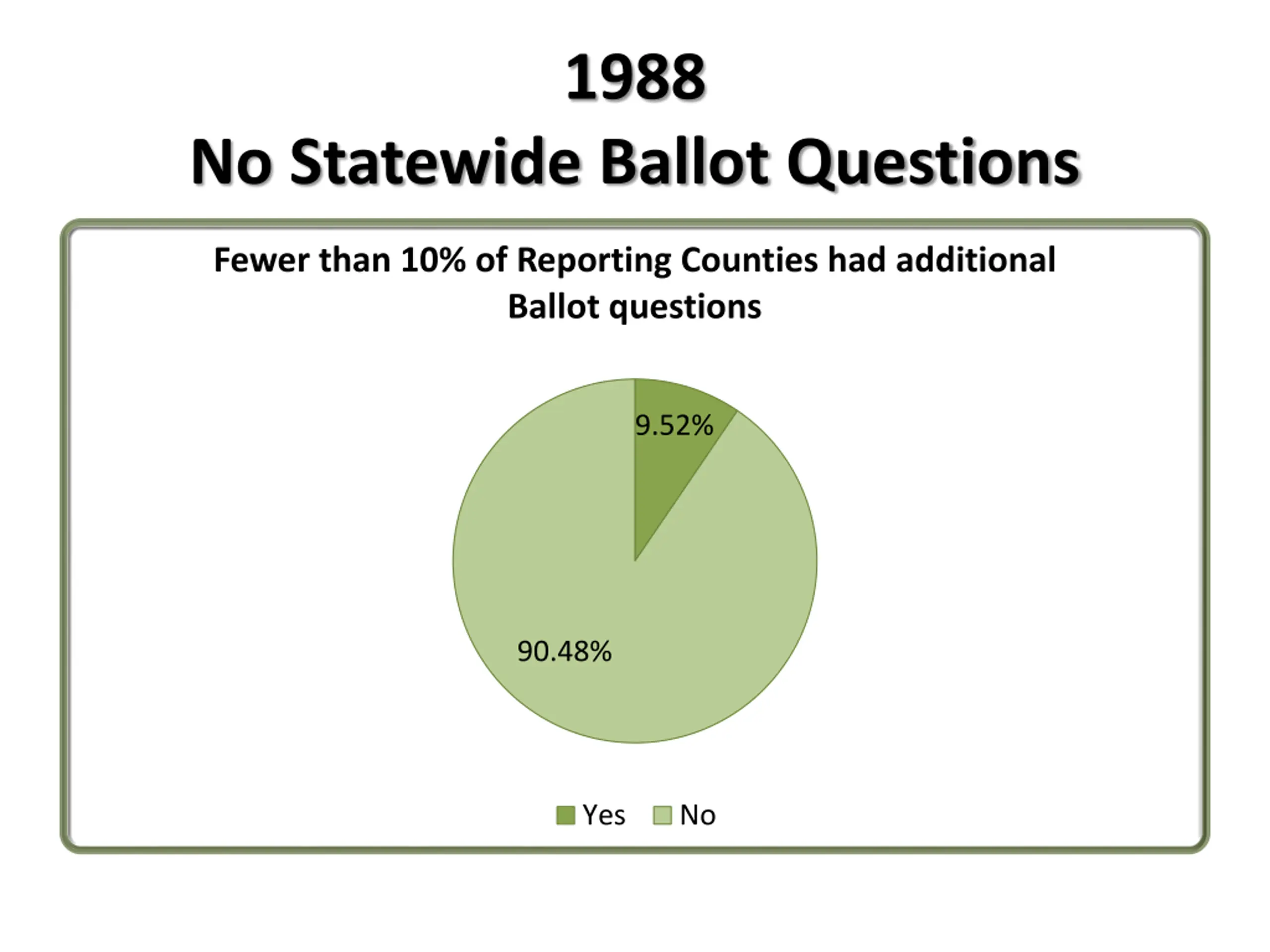 1988 No Statewide Ballot Questions Fewer than 10% of Reporting Counties had additional Ballot questions 9.52% 90.48% Yes No