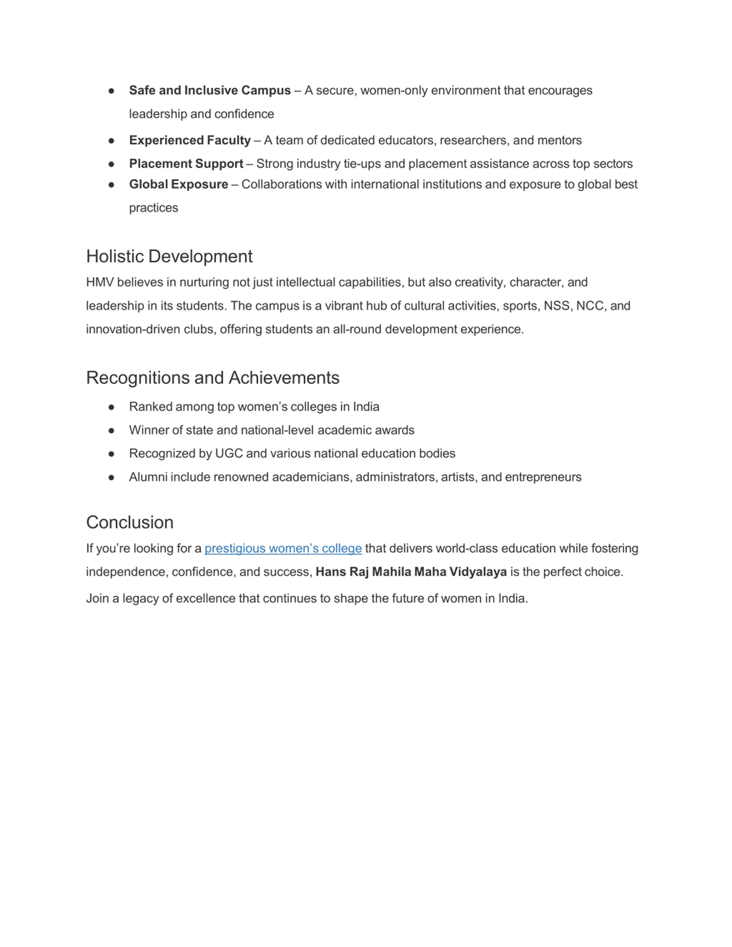 Safe and Inclusive Campus A secure, women-only environment that encourages leadership and confidence Experienced Faculty A team of dedicated educators, researchers, and mentors Placement Support Strong industry tie-ups and placement assistance across top sectors Global Exposure Collaborations with international institutions and exposure to global best practices Holistic Development HMV believes in nurturing not just intellectual capabilities, but also creativity, character, and leadership in its students. The campus is a vibrant hub of cultural activities, sports, NSS, NCC, and innovation-driven clubs, offering students an all-round development experience. Recognitions and Achievements Ranked among top women s colleges in India Winner of state and national-level academic awards Recognized by UGC and various national education bodies Alumni include renowned academicians, administrators, artists, and entrepreneurs Conclusion If you re looking for a prestigious women s college that delivers world-class education while fostering independence, confidence, and success, Hans Raj Mahila Maha Vidyalaya is the perfect choice. Join a legacy of excellence that continues to shape the future of women in India.